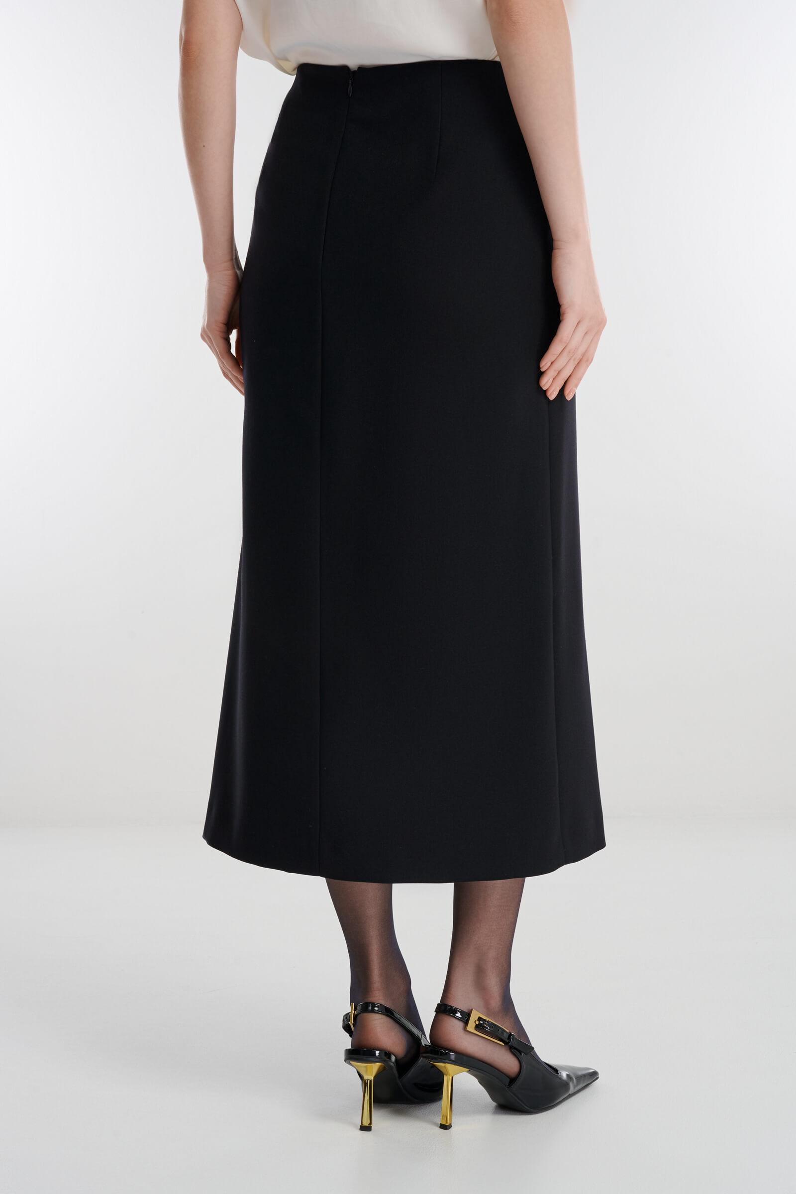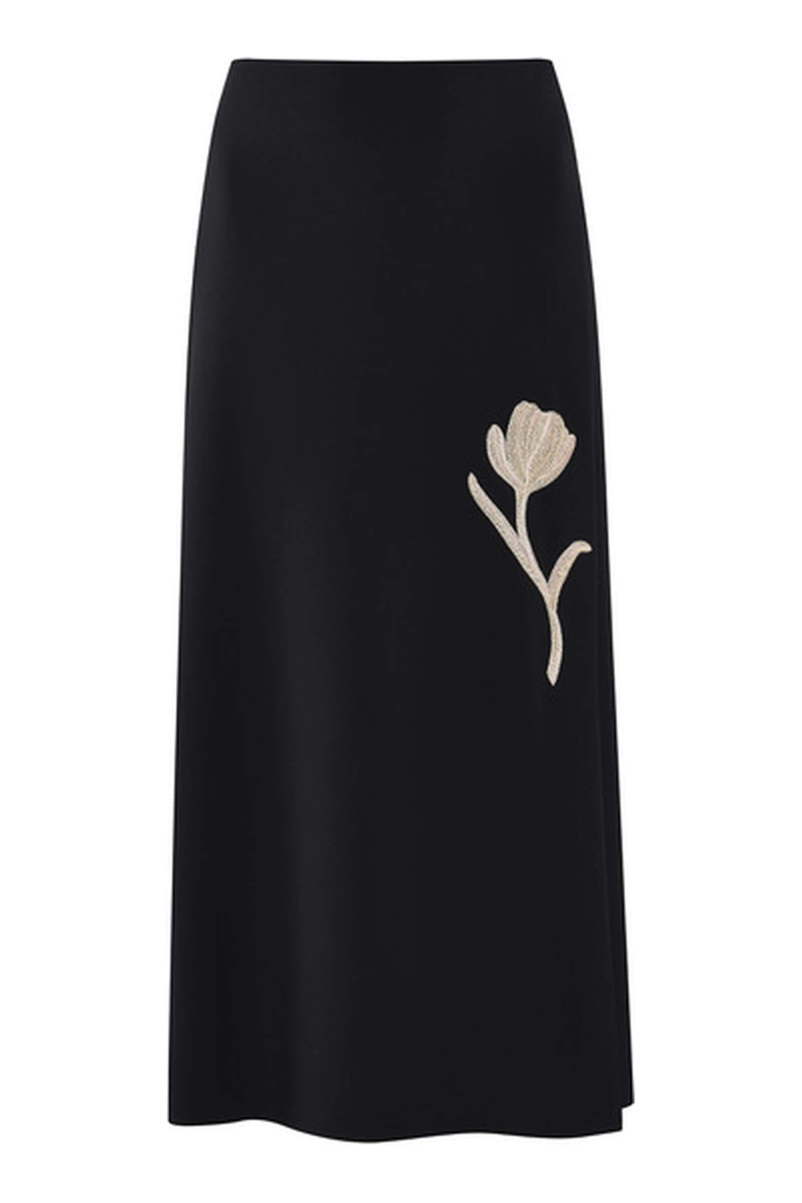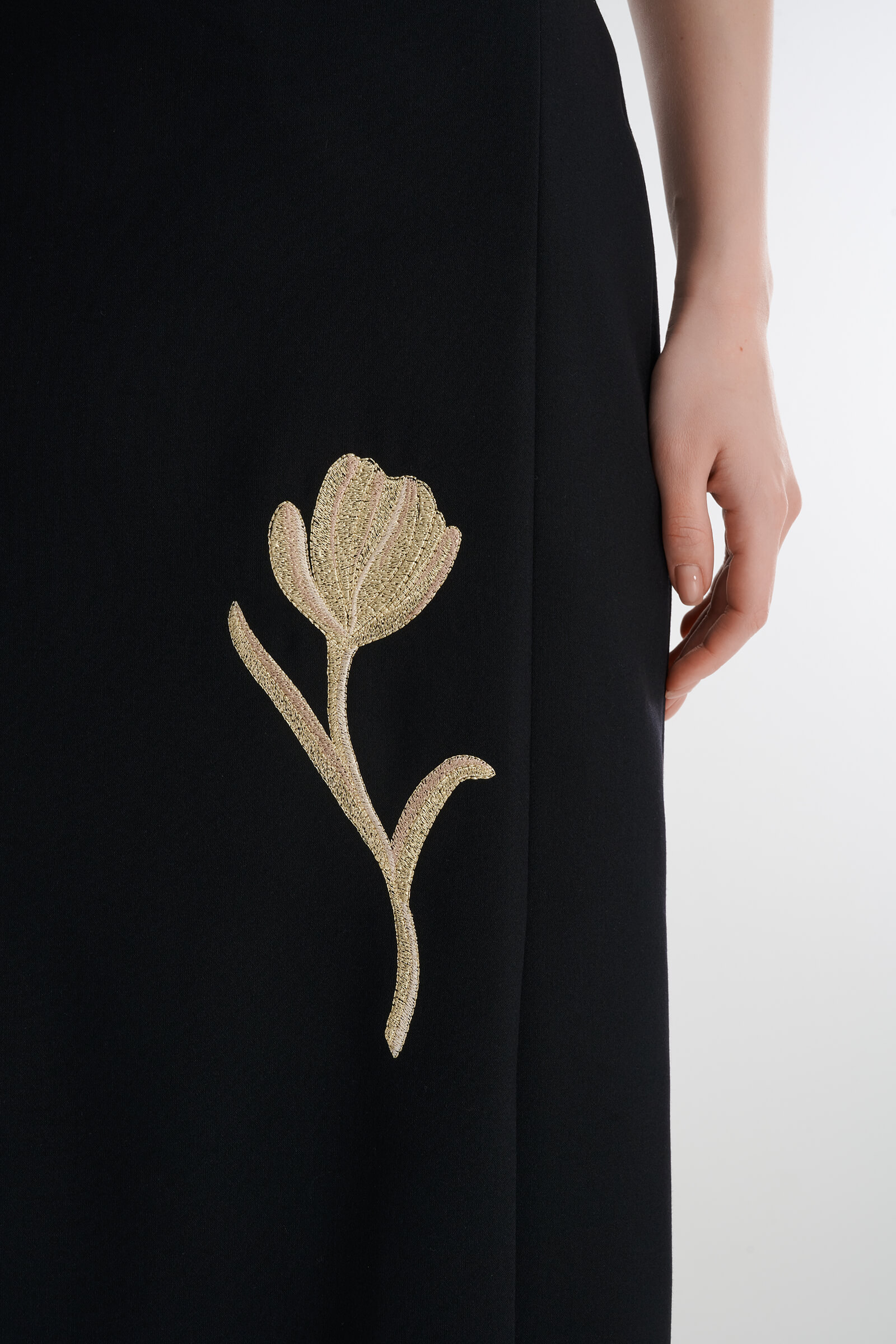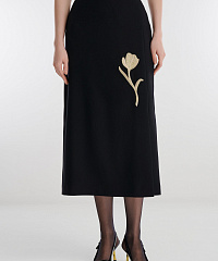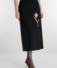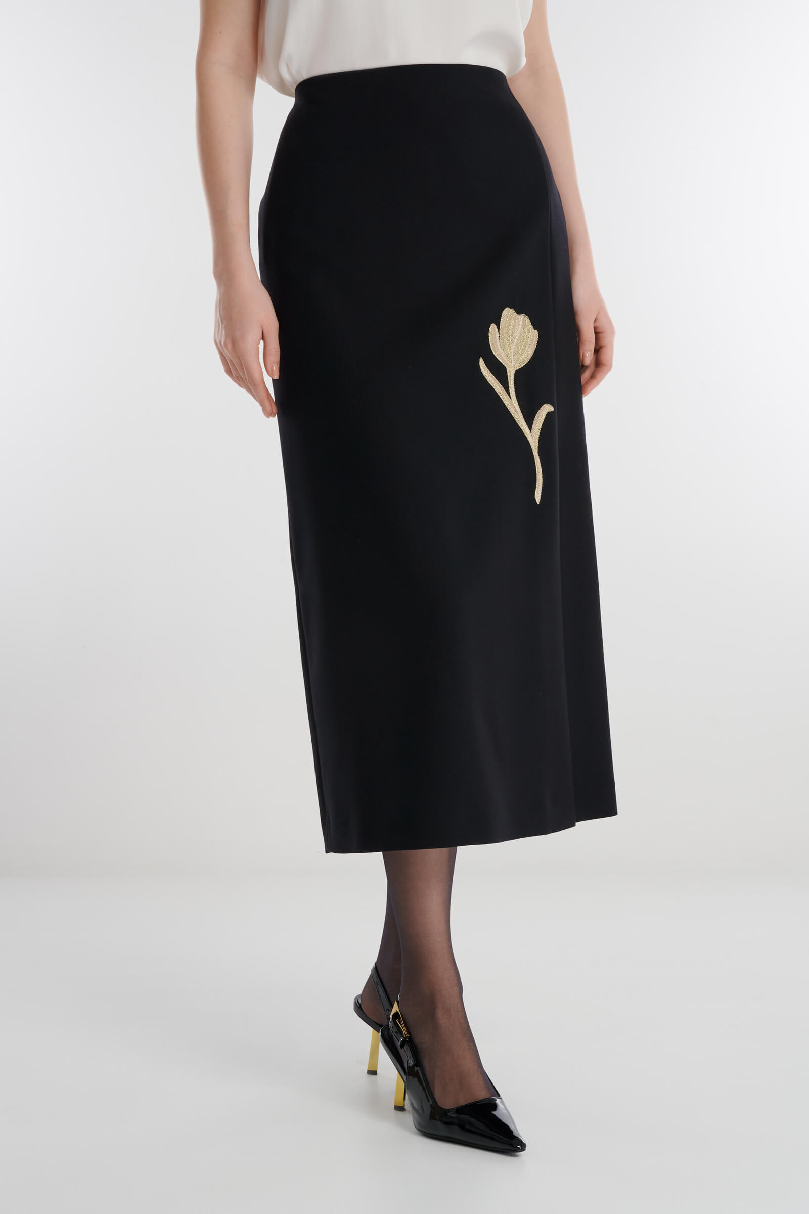 Юбка-карандаш в длине мидакси красиво подчеркивает фигуру, визуально удлиняя силуэт. Акцентом модели становится цветочная вышивка, которая добавляет образу утонченности. Шлица спереди обеспечивает свободу движения, а подкладка из вискозы делает посадку комфортной.