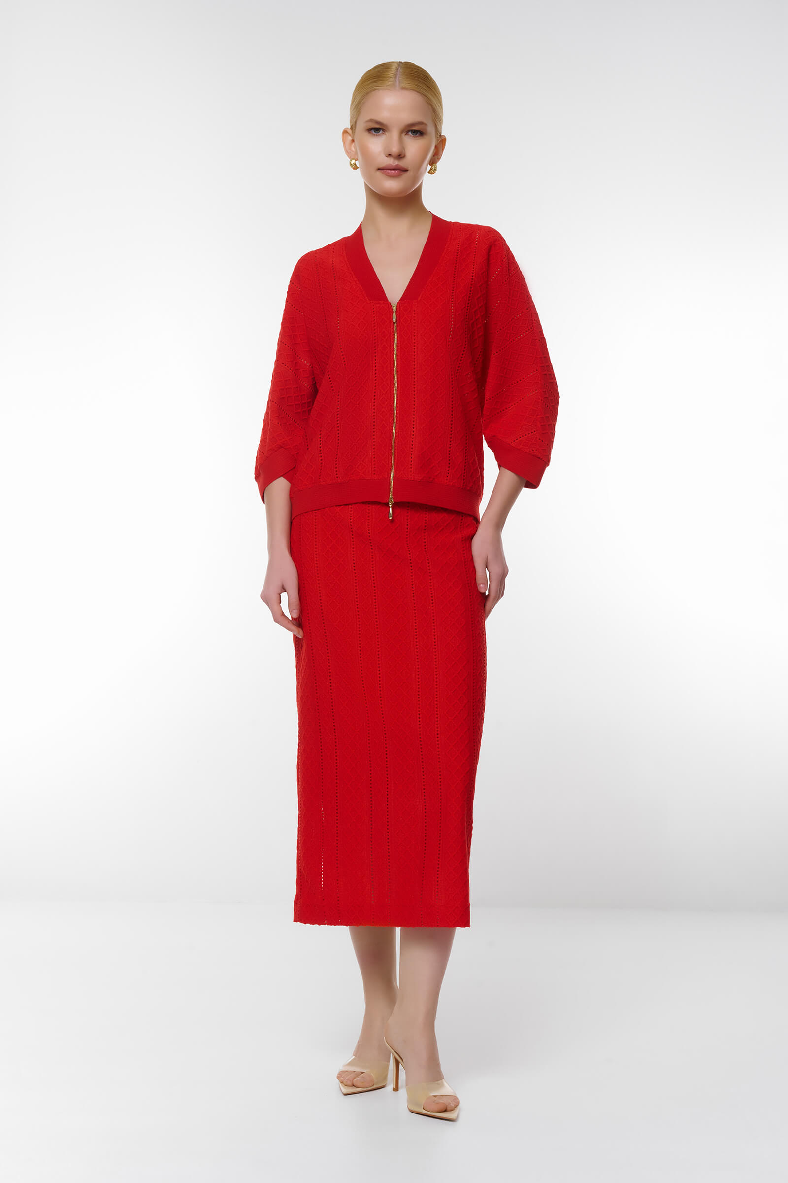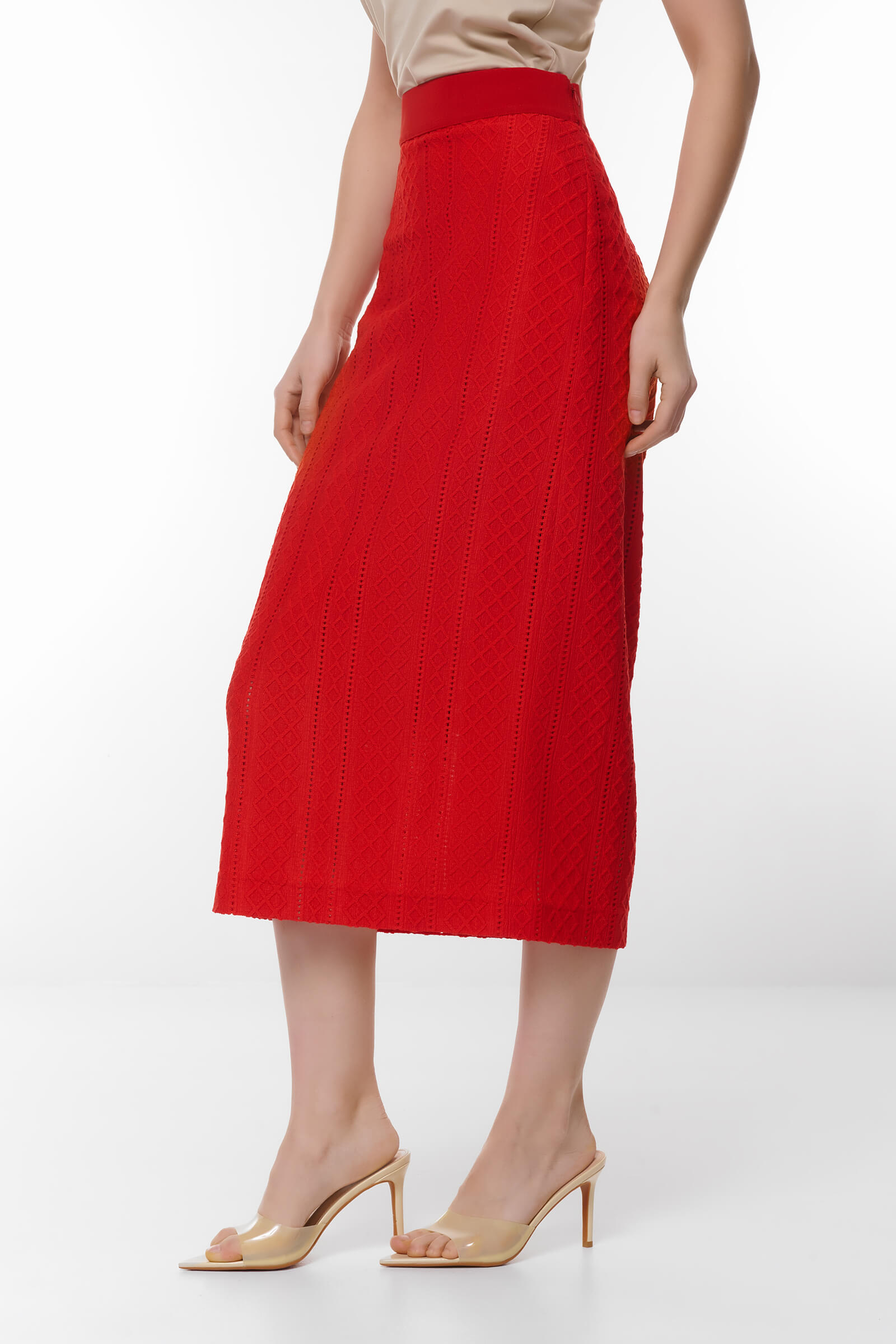 Эта ярко-красная юбка-карандаш из трикотажа — идеальный выбор для женщин, стремящихся к стилю и комфорту. Благодаря эластичному поясу и средней длине, юбка отлично подчеркивает фигуру, создавая стильный силуэт. Уникальный узор в виде ромбов добавляет изюминку и делает изделие ярким акцентом в вашем гардеробе.Создавайте модные образы с этой юбкой, дополняя её эффектными блузами или жакетами!
