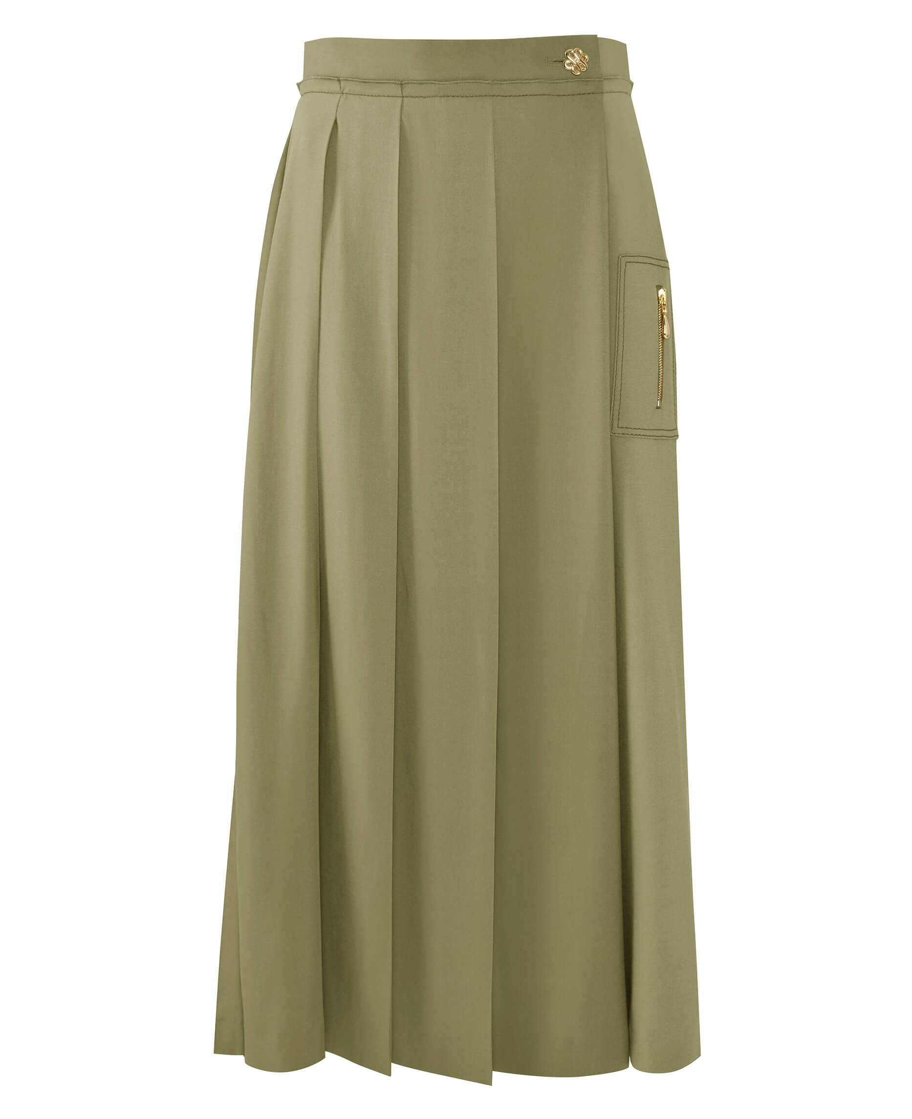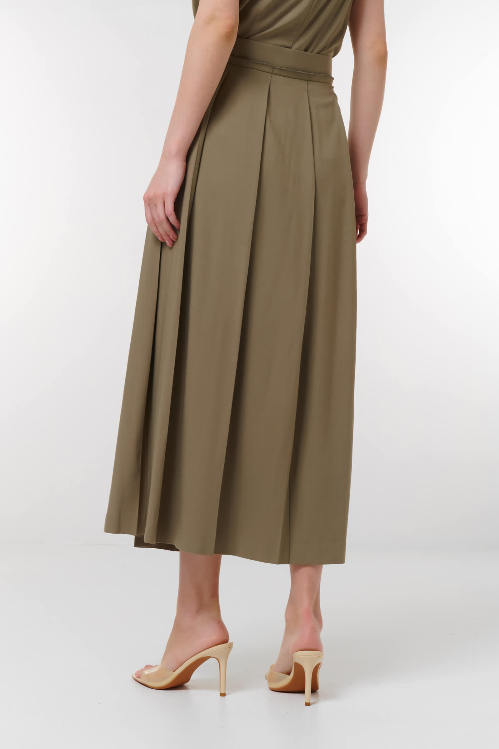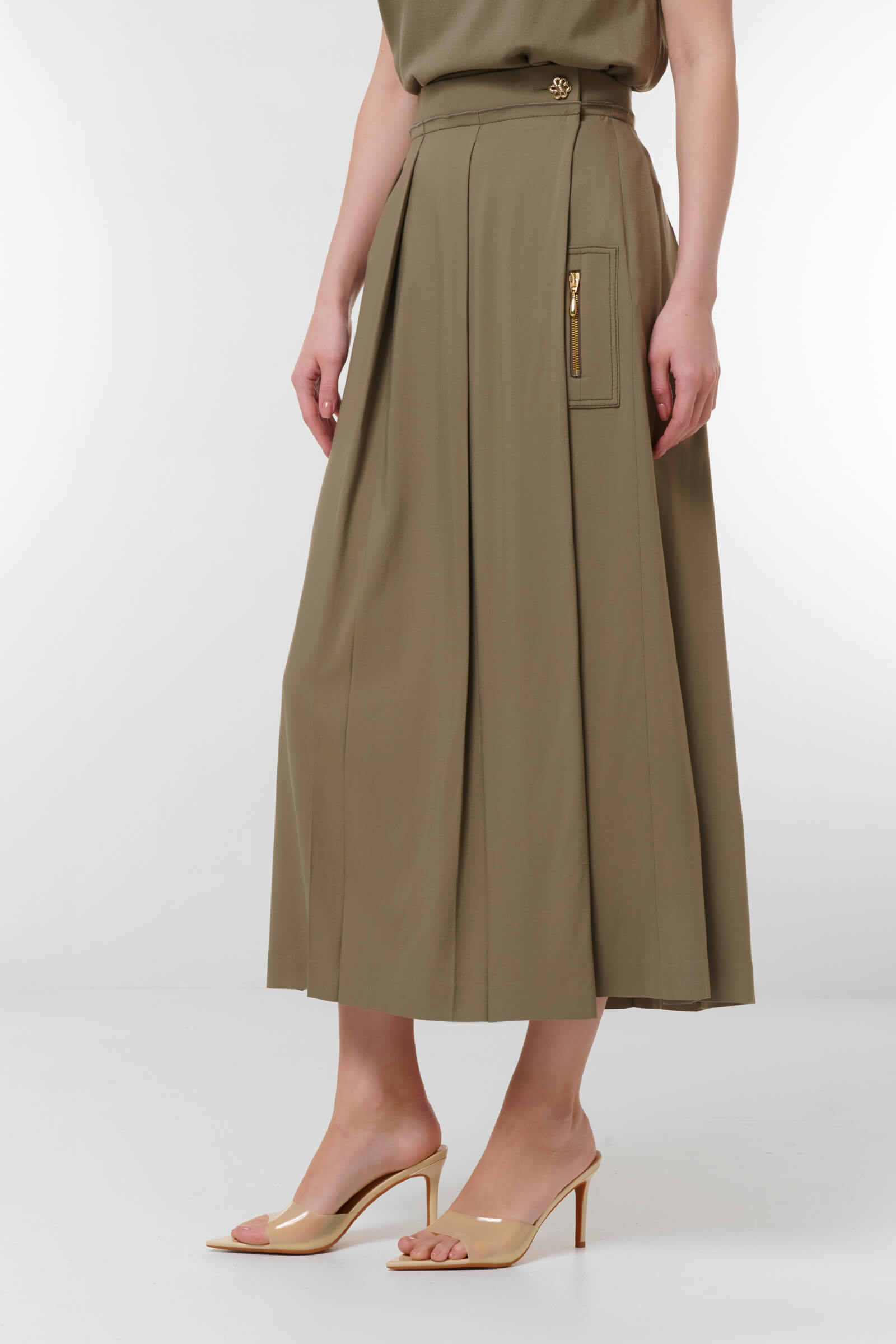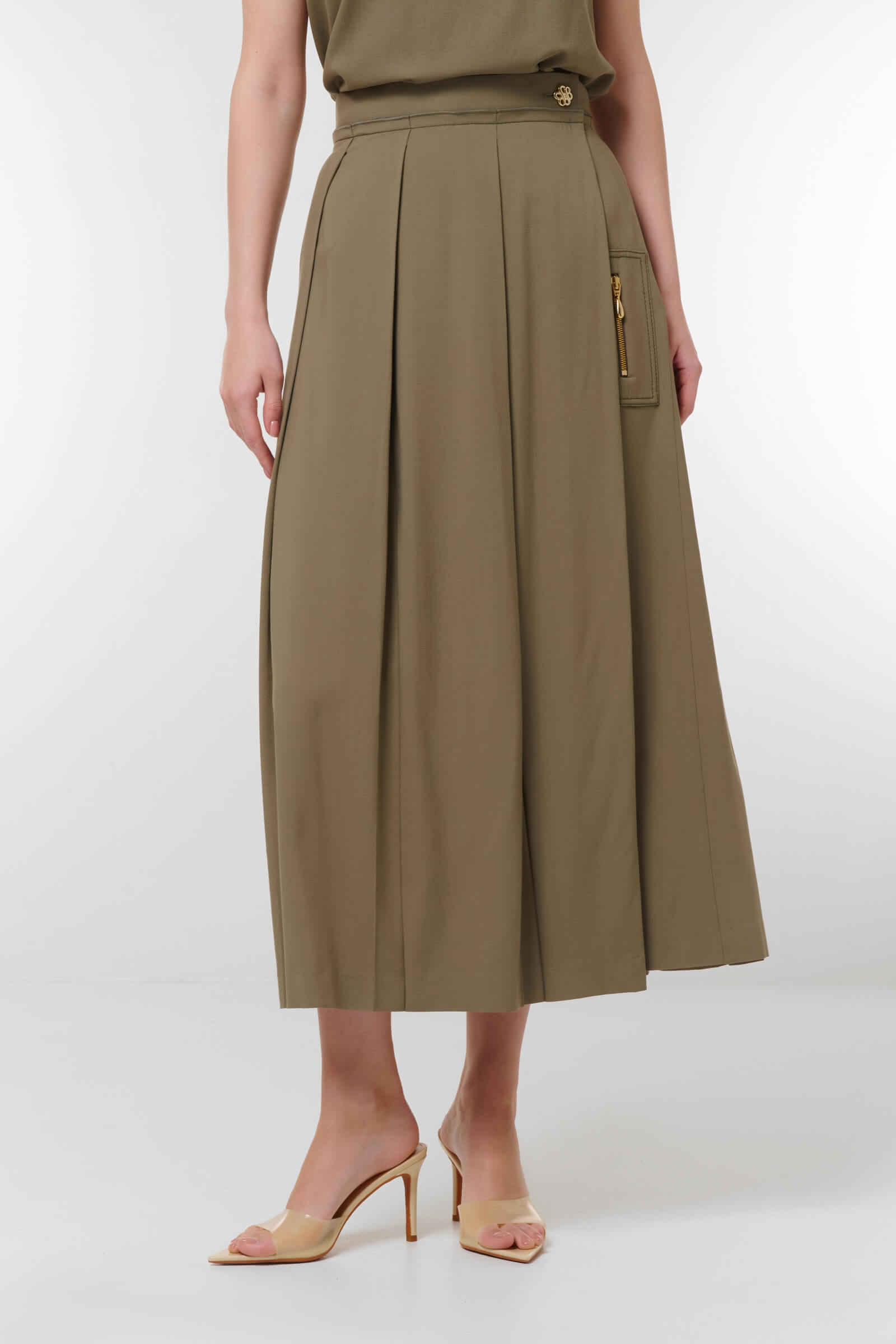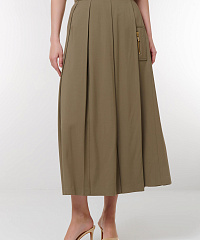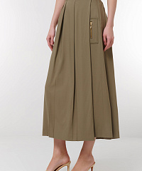 Погрузитесь в элегантность с нашей стильной юбкой миди с клиньями! В оливковом цвете, эта юбка сочетает в себе лаконичность и утонченность. Уникальные складки создают динамичный силуэт, а боковой карман с застежкой-молнией добавляет функциональность. Идеально подходит для создания как повседневных, так и деловых образов.