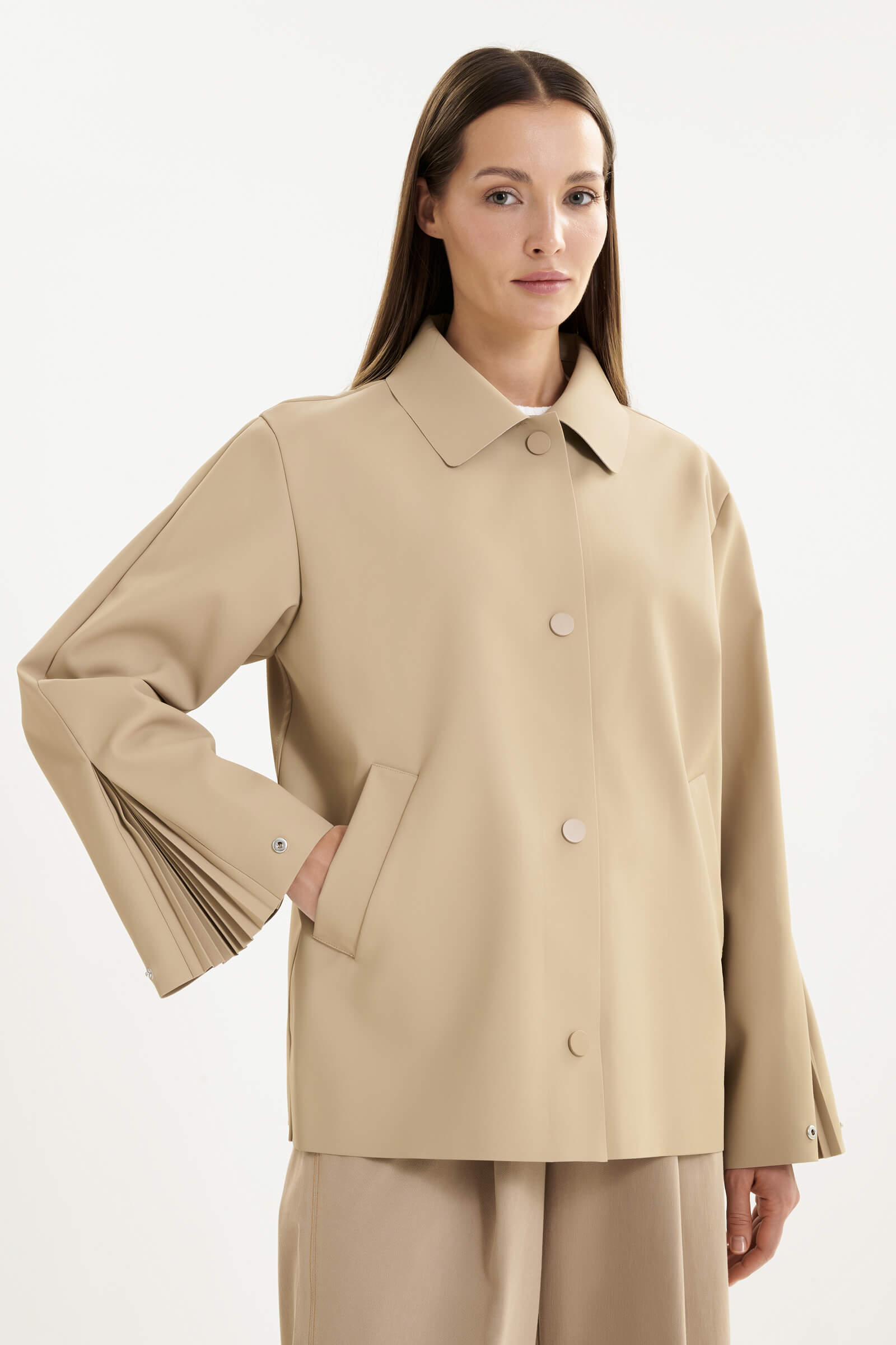 - Рукав полной длины с застежкой на кнопку и эффектной плиссировкой