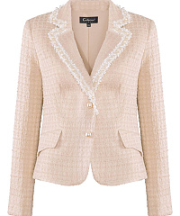 Жакет придется по душе ценителям нежного и женственного дизайна. Модель классического кроя украсили тесьмой с объемным декором и акцентными пуговицами. Для создания изделия выбрали смесовый материал на основе вискозы — приятный на ощупь и отлично пропускающий воздух. Дополнить образ с жакетом можно юбкой из той же линейки.