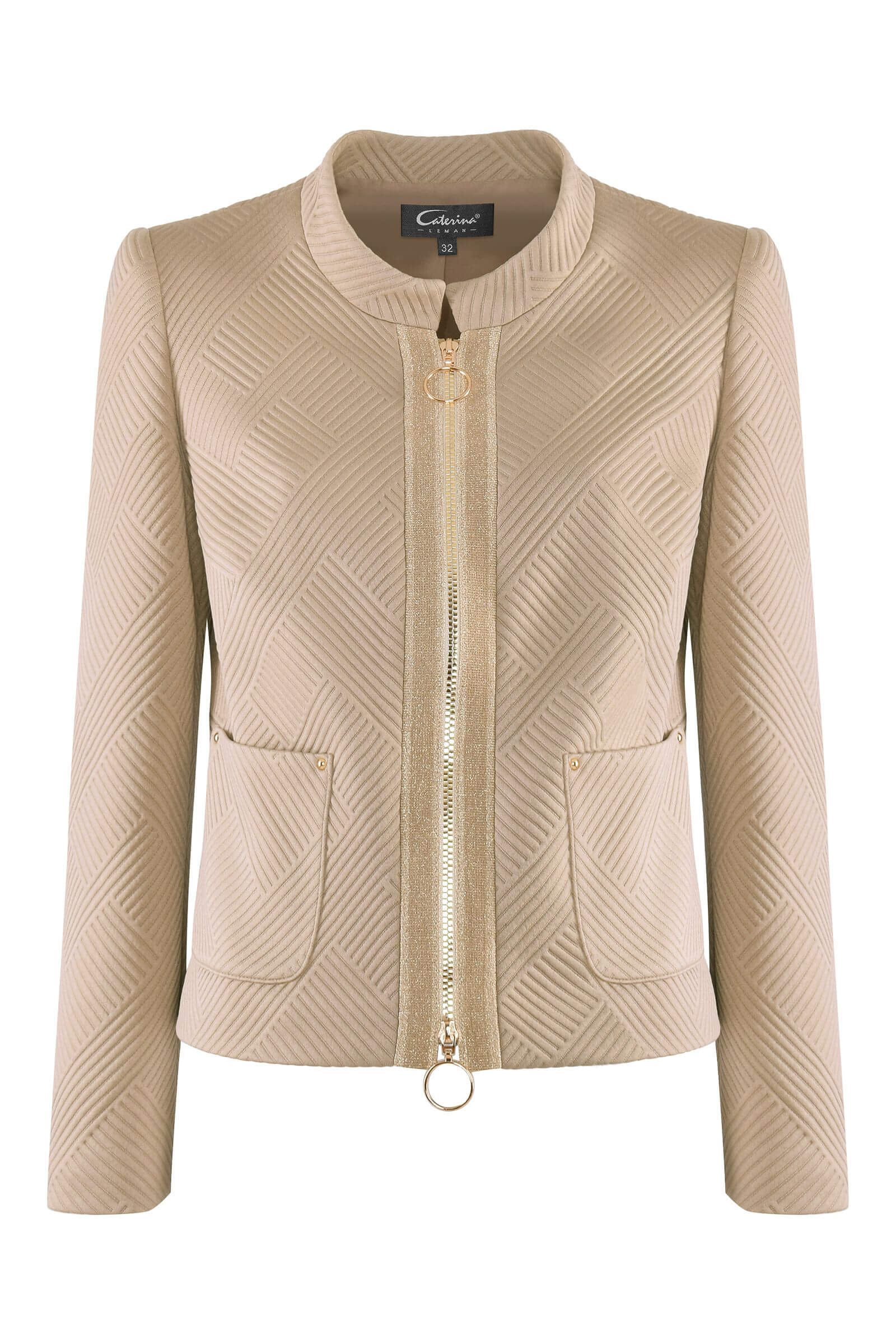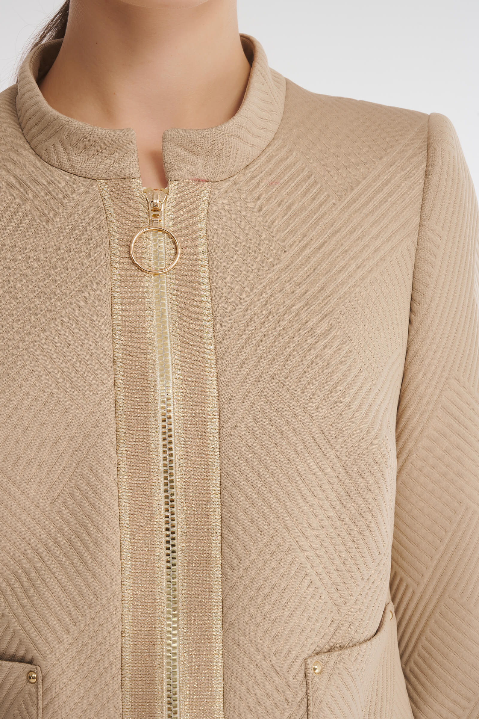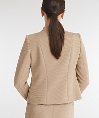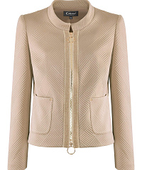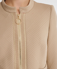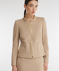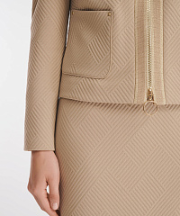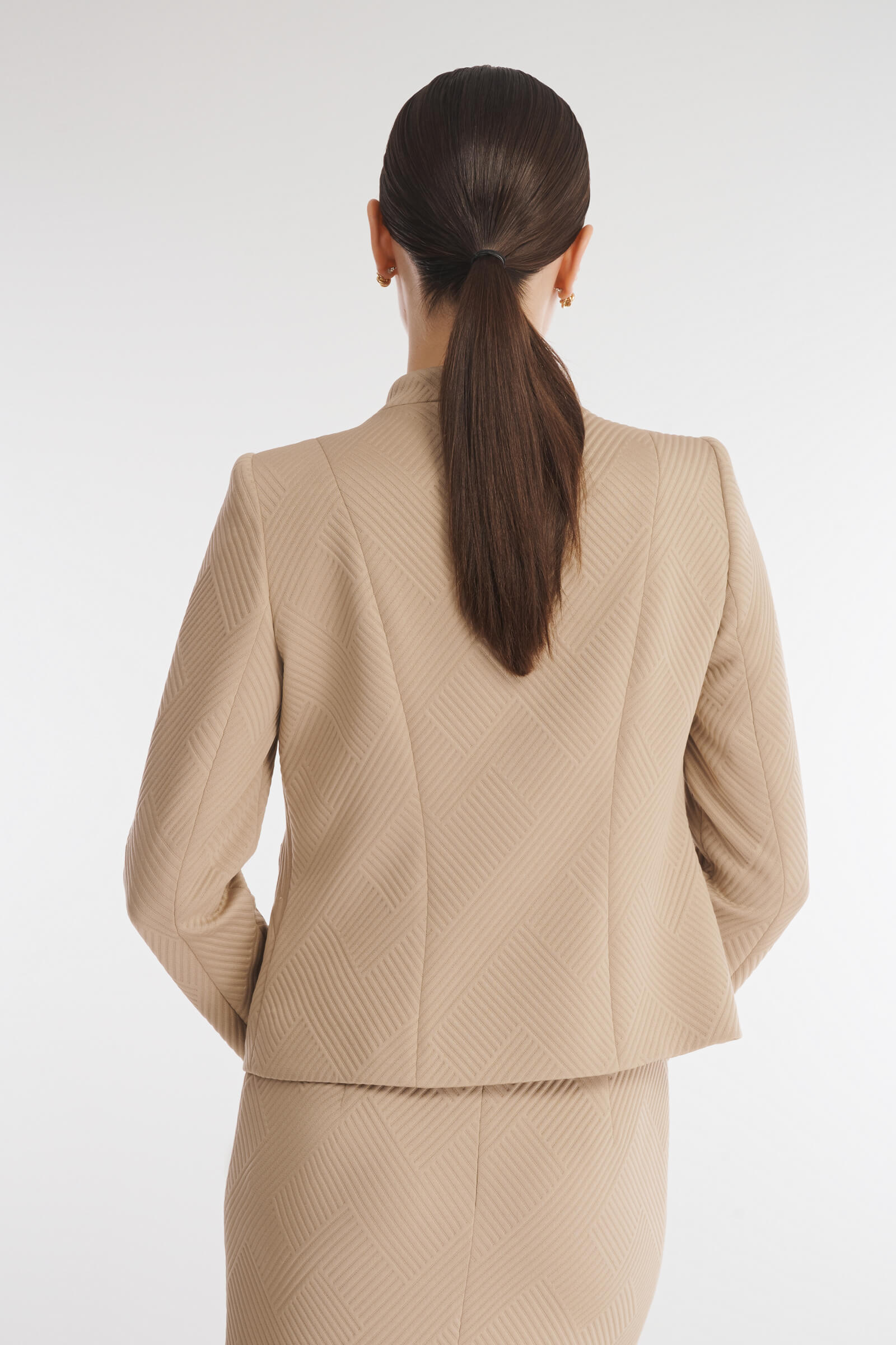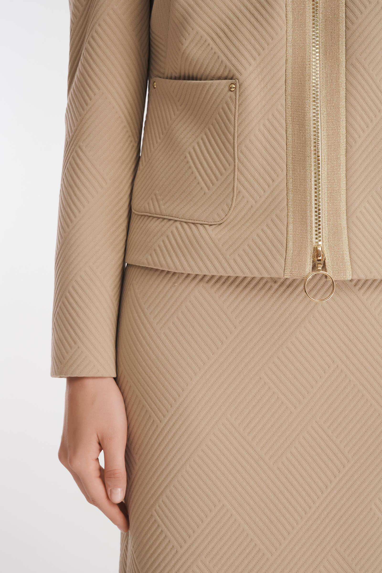 Для создания жакета был выбран мягкий фактурный материал на основе вискозы с выраженным геометрическим узором. Застежка на молнию, подчеркнутая вставками с люрексом, становится акцентной деталью дизайна изделия. Небольшие подплечники помогают жакету сохранять форму. Сочетайте изделие с юбкой из той же линейки для создания стильного тотал-лука.