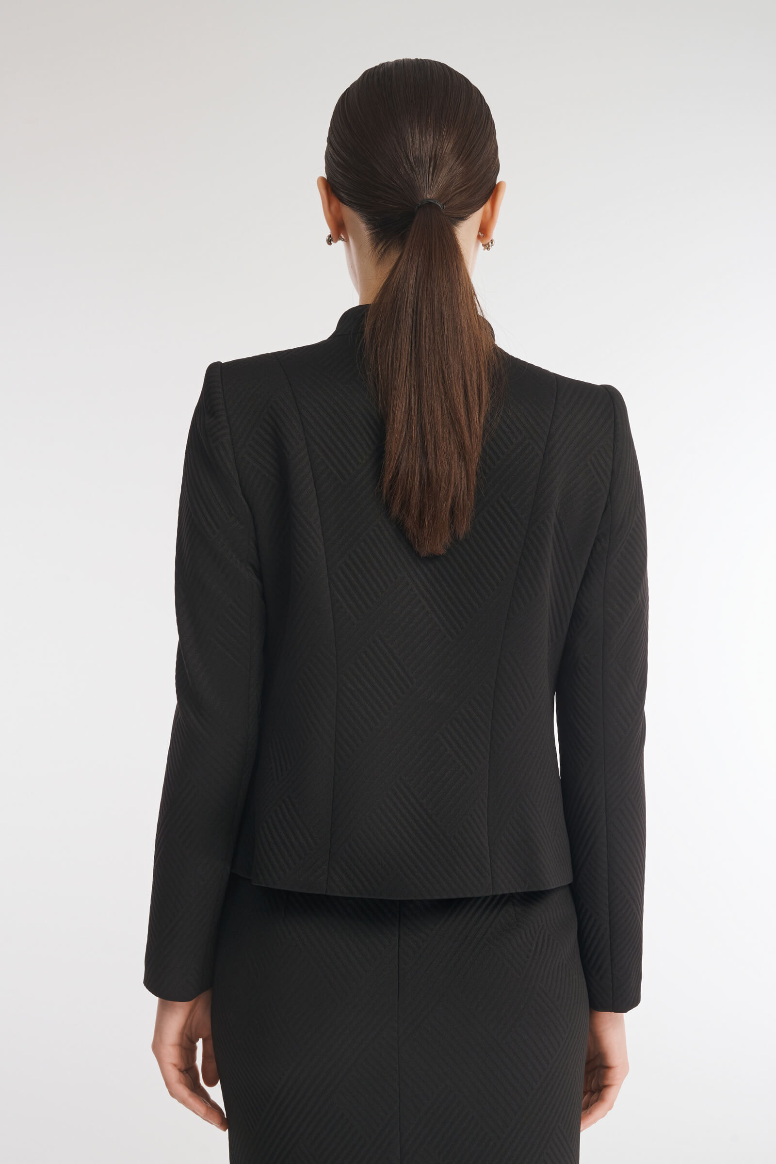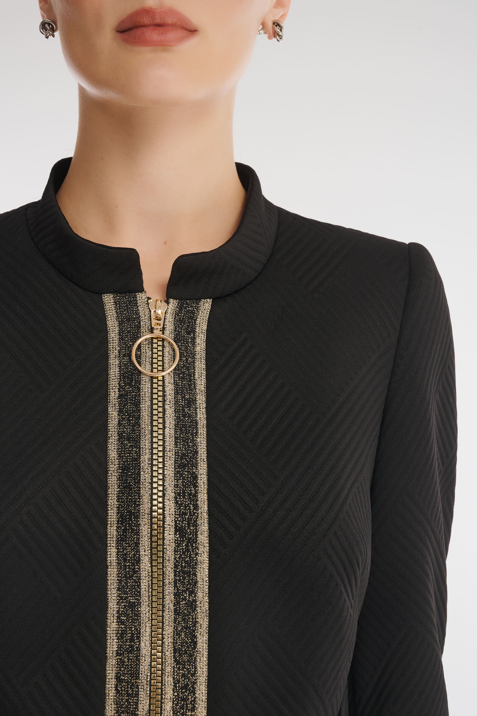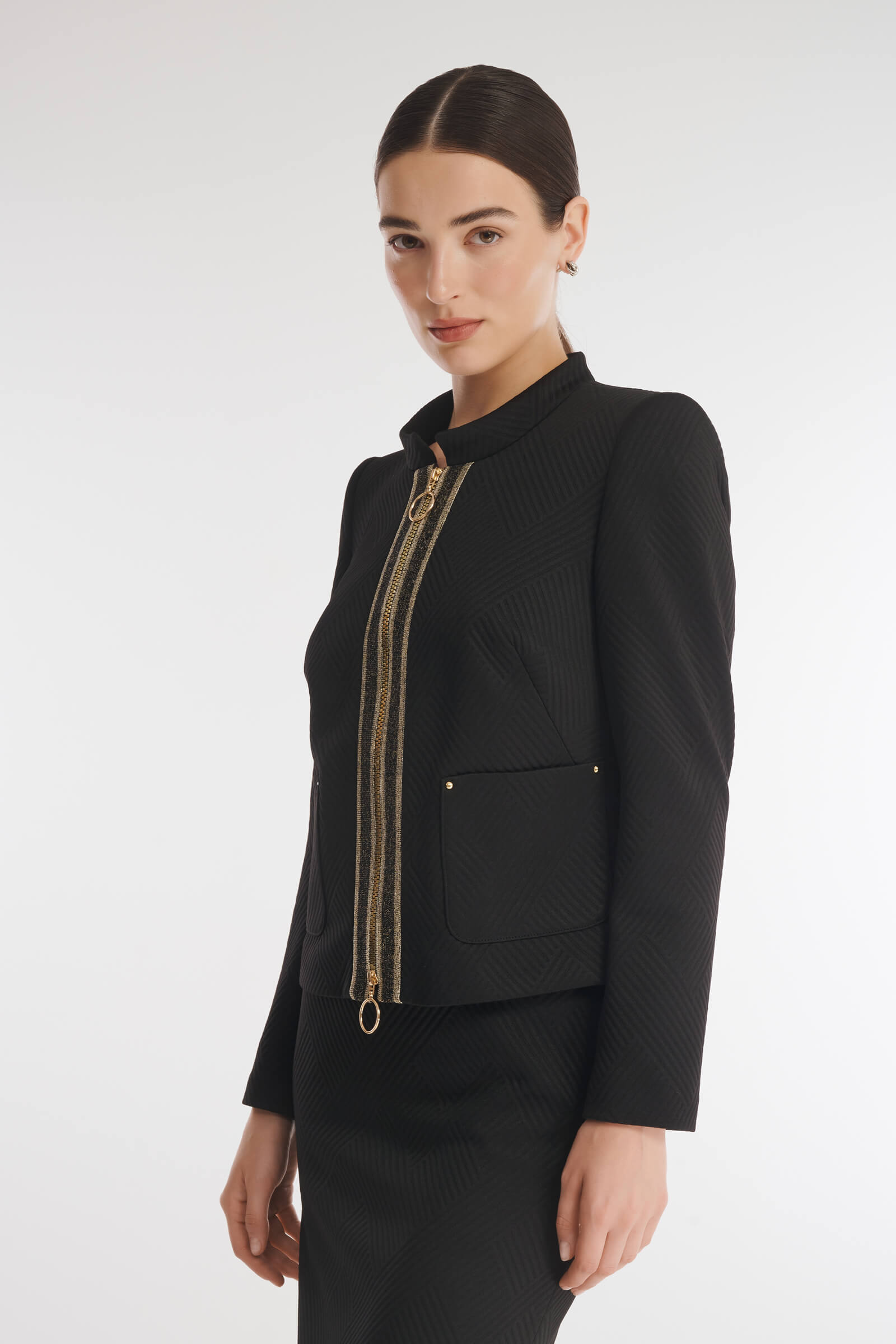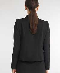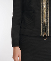Для создания жакета был выбран мягкий фактурный материал на основе вискозы с выраженным геометрическим узором. Застежка на молнию, подчеркнутая вставками с люрексом, становится акцентной деталью дизайна изделия. Небольшие подплечники помогают жакету сохранять форму. Сочетайте изделие с юбкой из той же линейки для создания стильного тотал-лука.