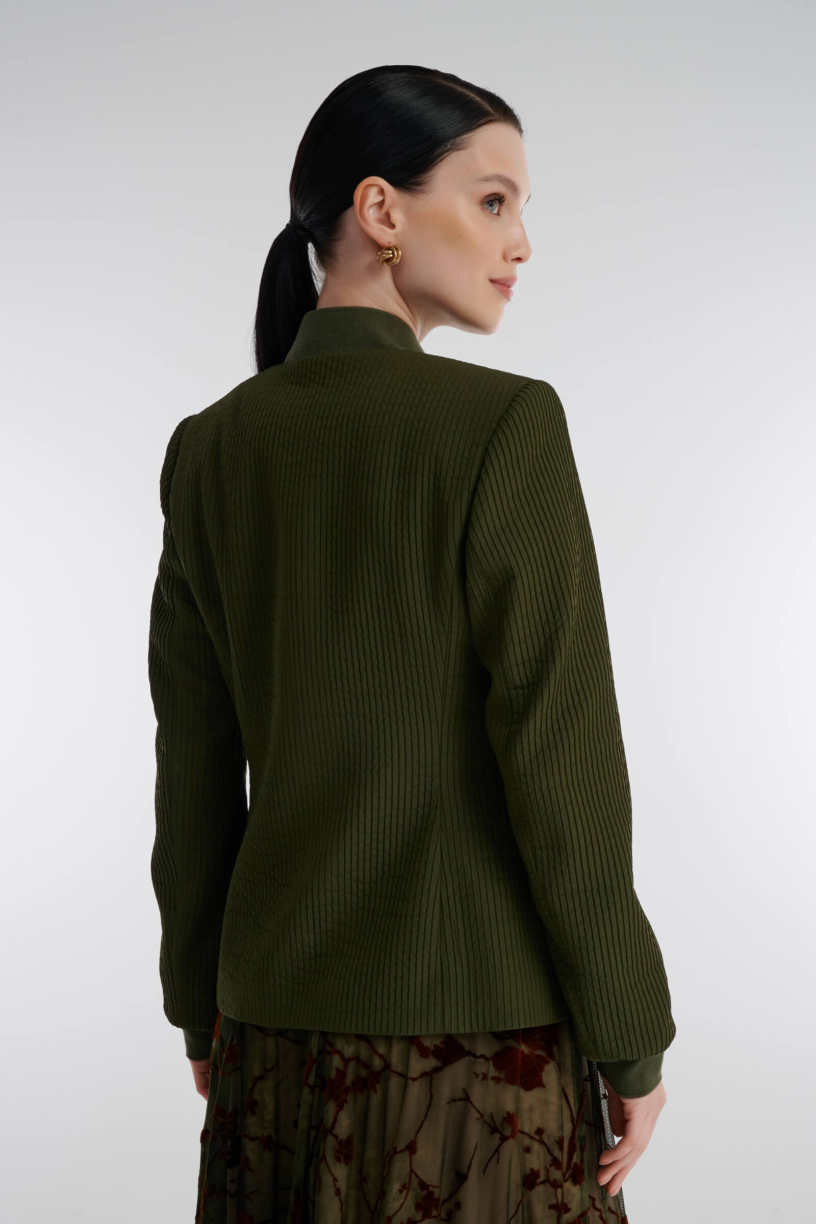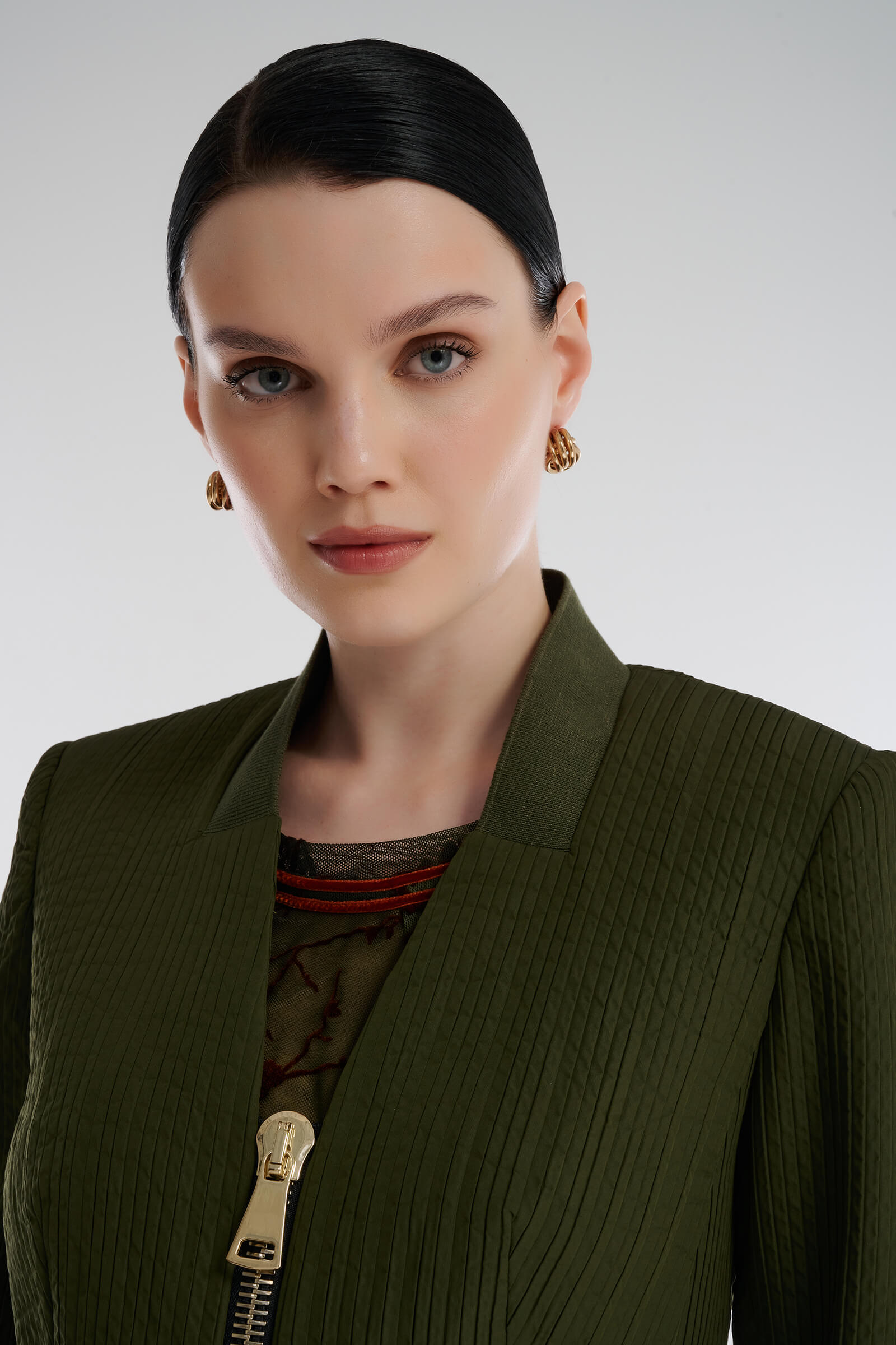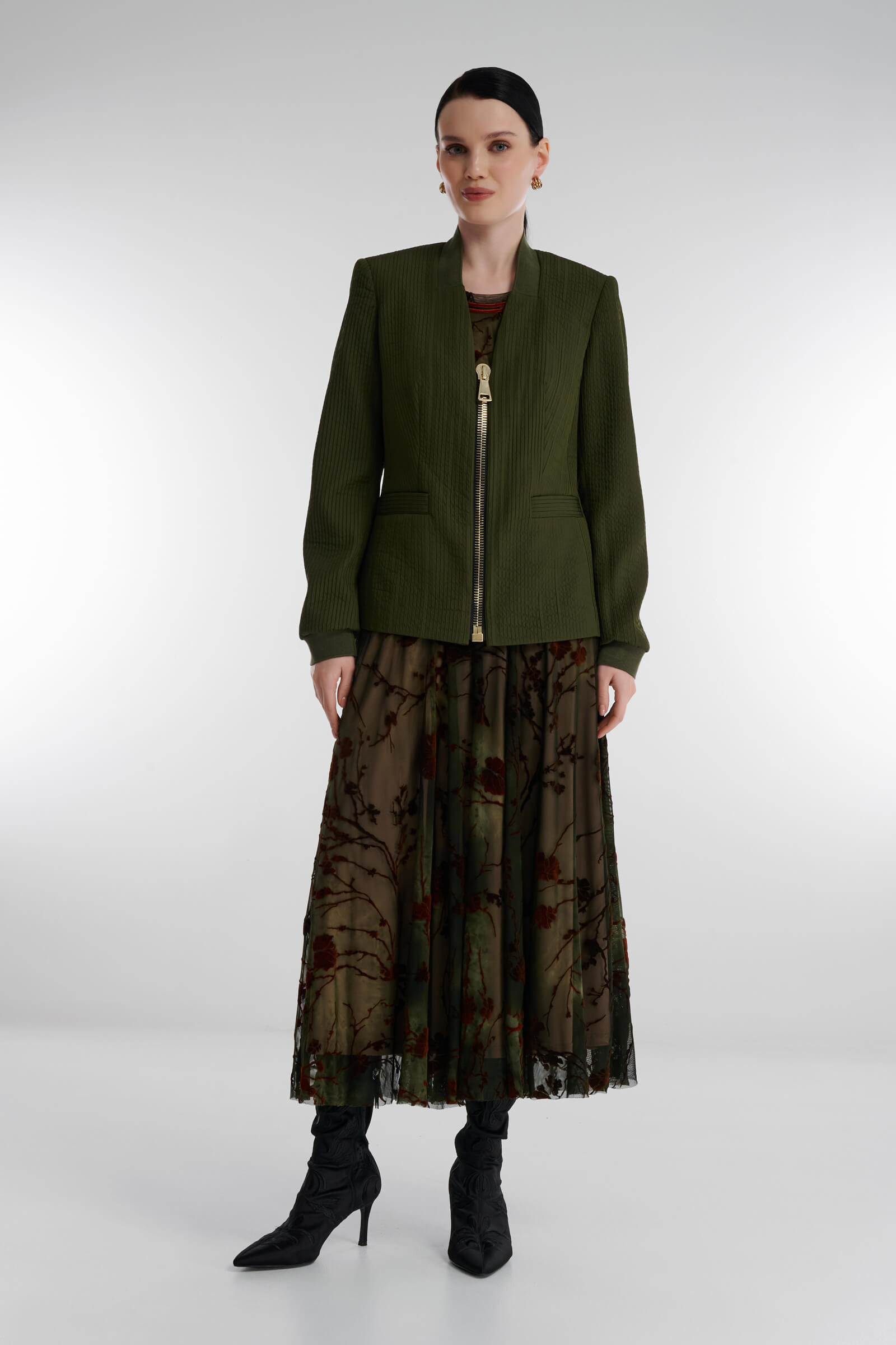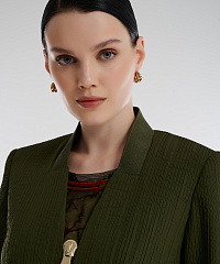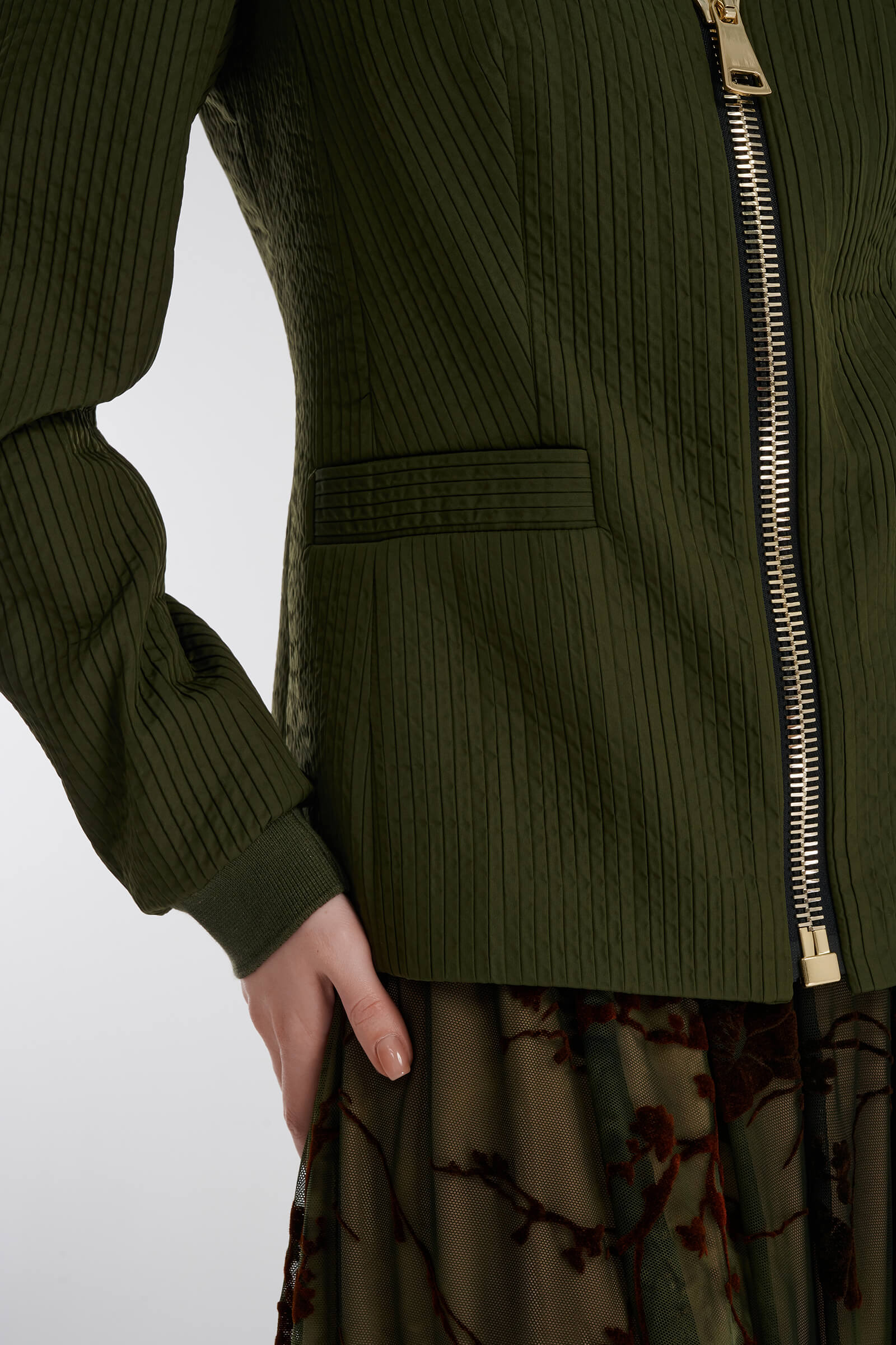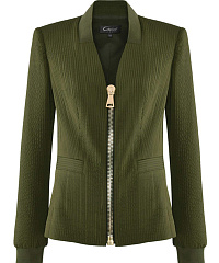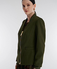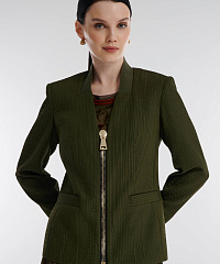 Менее формальная и более практичная альтернатива пиджакам — фактурный жакет. Универсальная модель с удобной застежкой на молнию и функциональными карманами отлично дополнит кэжуал образ как с джинсами, так и с платьем.