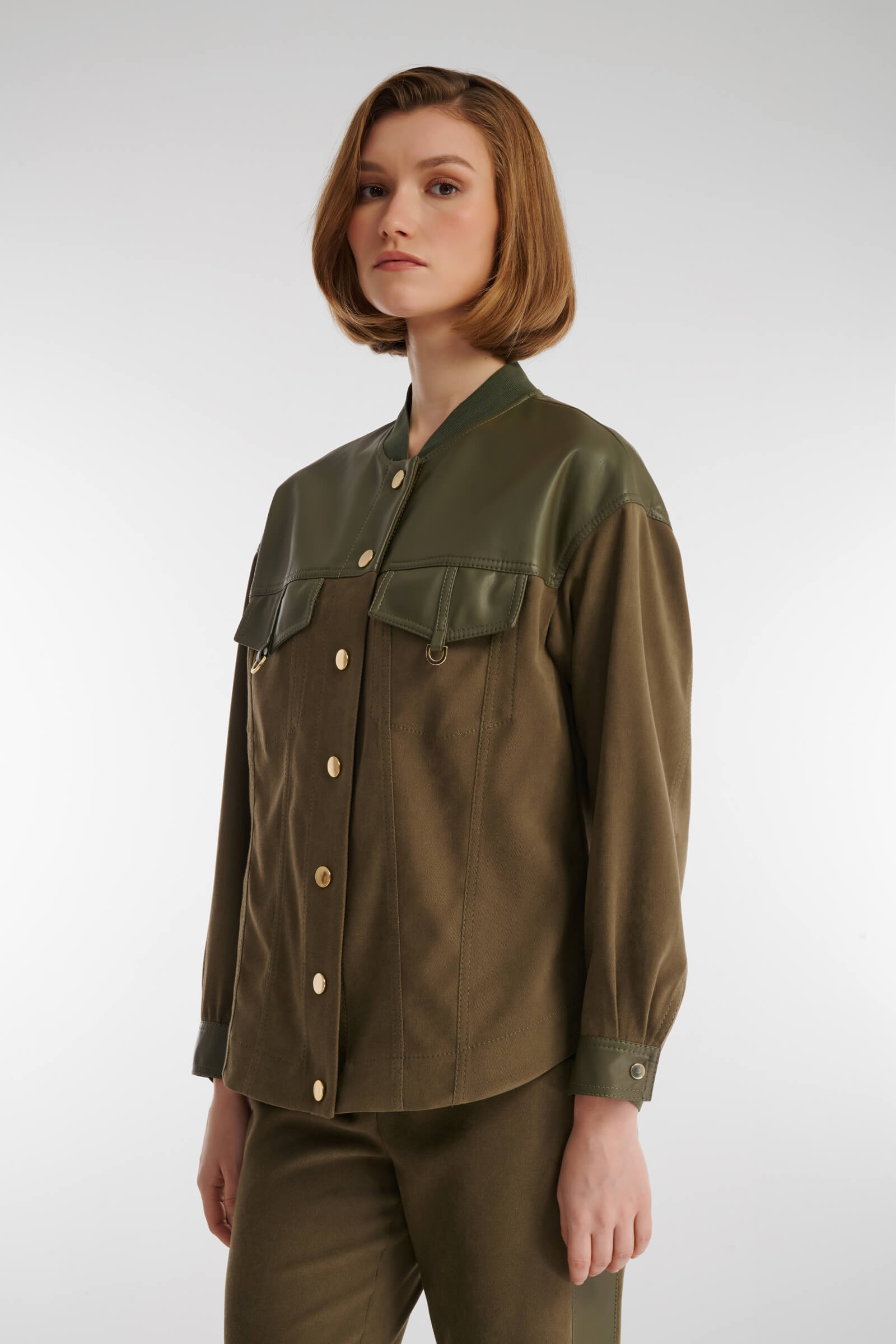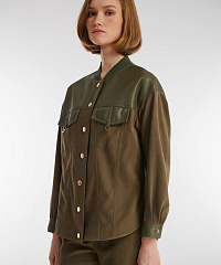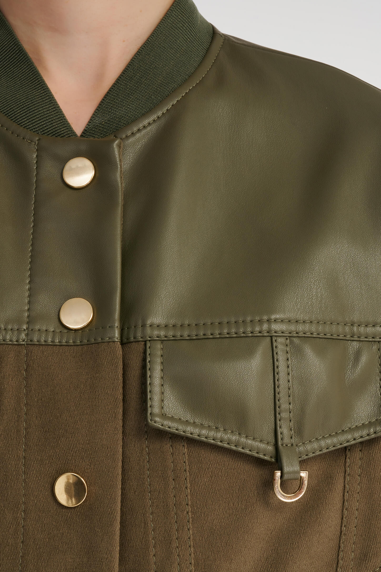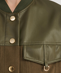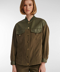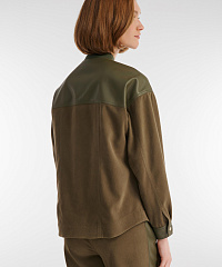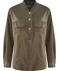 Жакет со вставками из экокожи станет стильным дополнением образов в стиле кэжуал. Свободный крой и спущенная линия плеча позволяют чувствовать себя комфортно. Накладные карманы отвечают за функциональность изделия. В пару к жакету можно подобрать брюки из той же линейки для создания готового комплекта.
