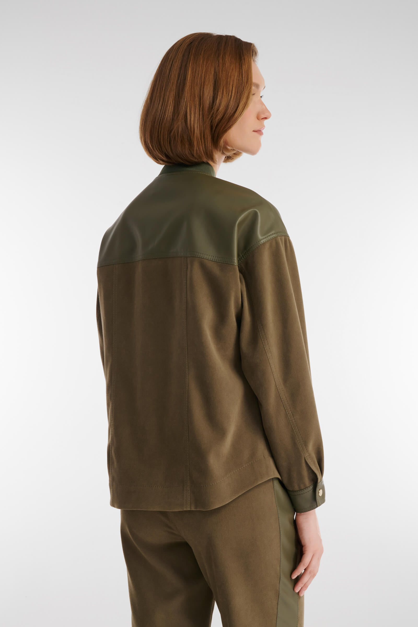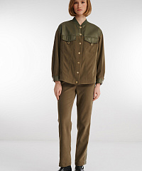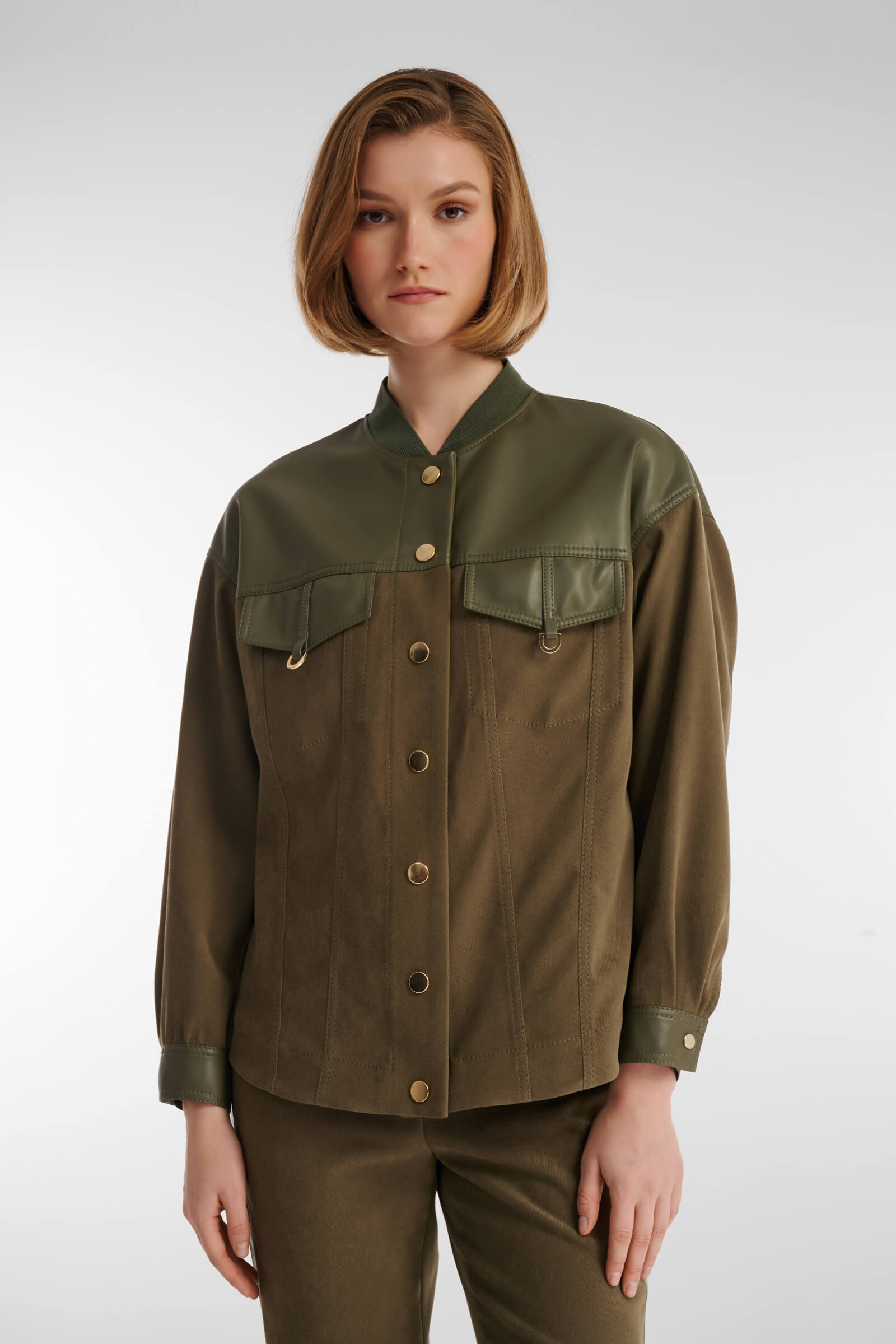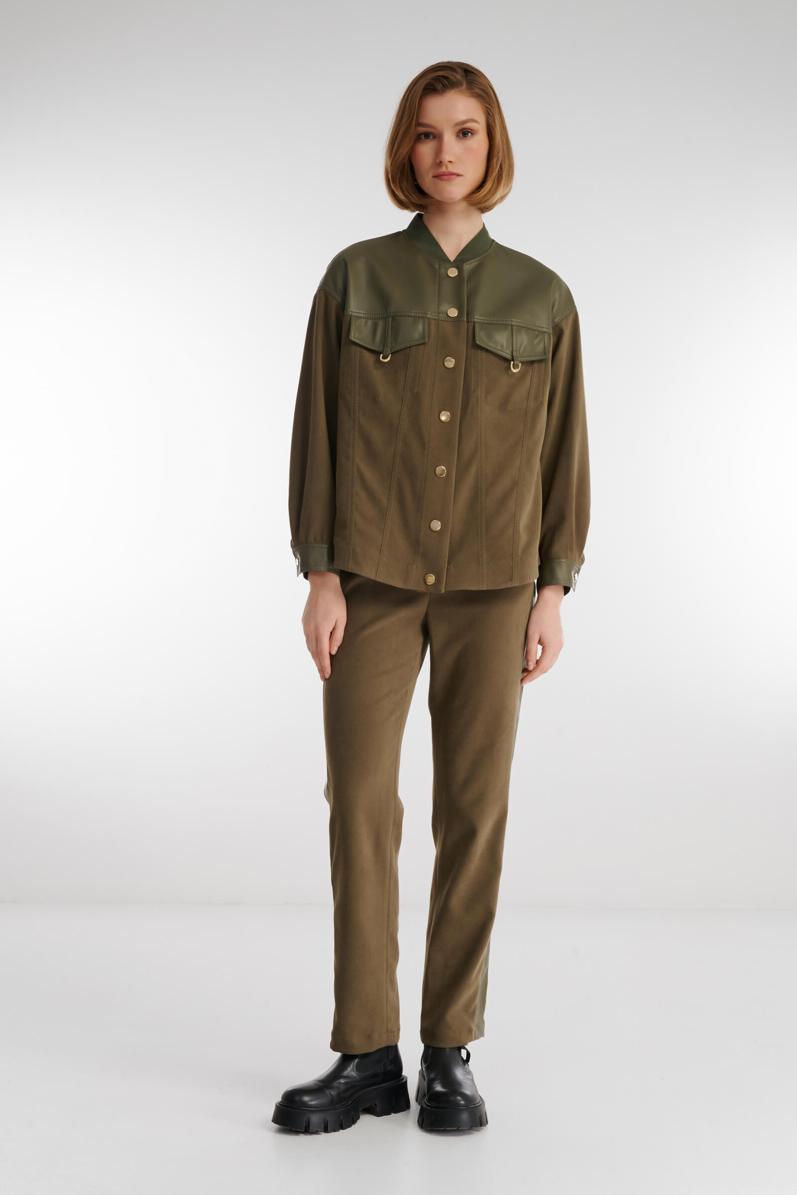 Жакет со вставками из экокожи станет стильным дополнением образов в стиле кэжуал. Свободный крой и спущенная линия плеча позволяют чувствовать себя комфортно. Накладные карманы отвечают за функциональность изделия. В пару к жакету можно подобрать брюки из той же линейки для создания готового комплекта.