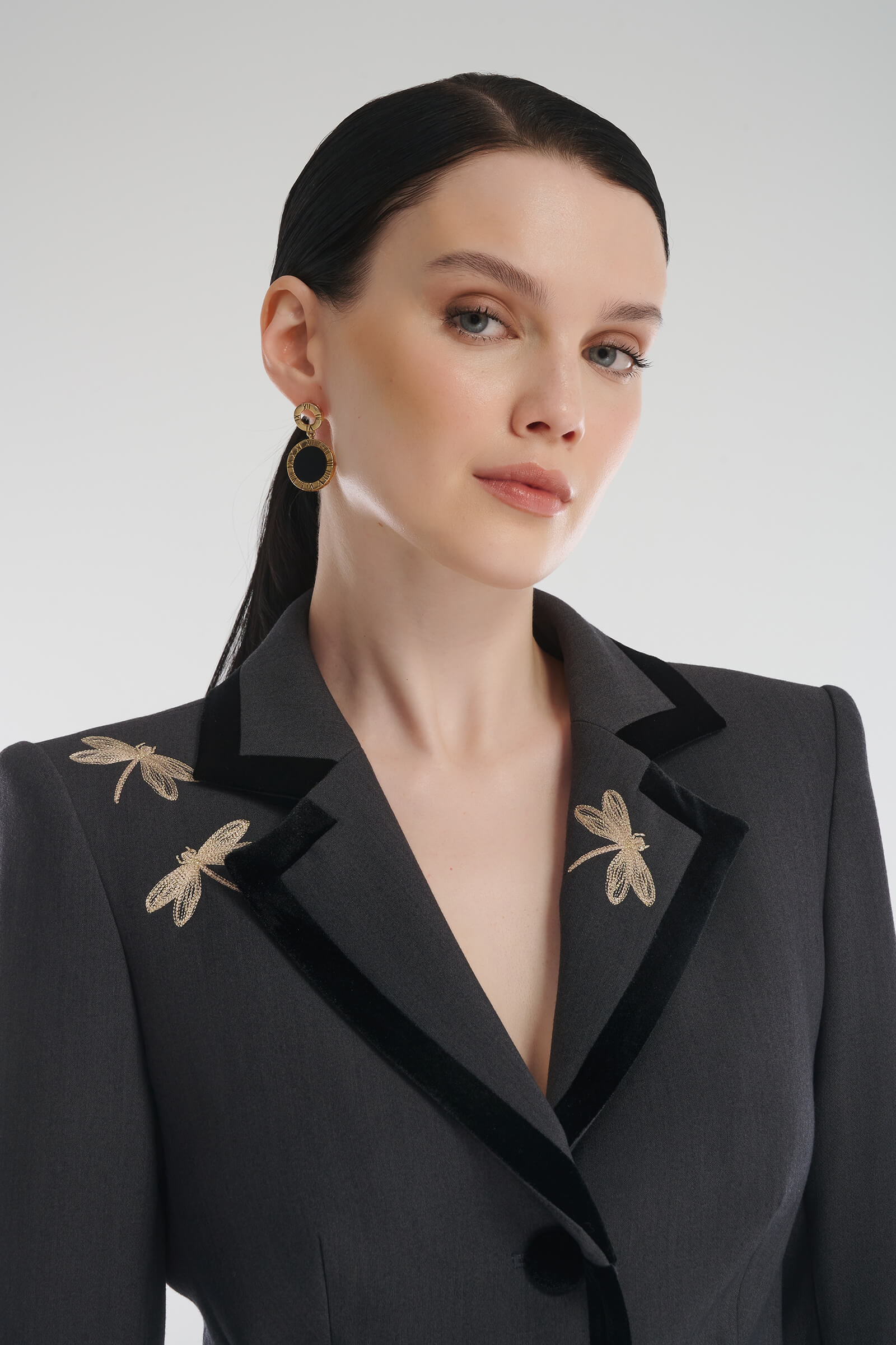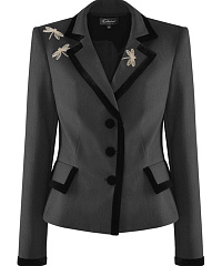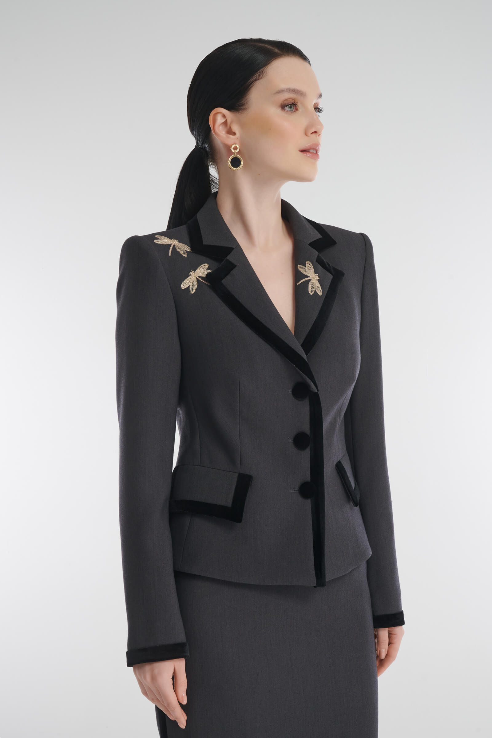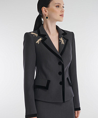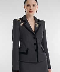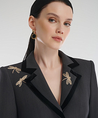 Жакет моментально притягивает внимание благодаря сочетанию элегантного кроя и утонченных акцентов. Бархатная окантовка подчеркивает линии, а вышивка в виде стрекоз добавляет изысканности. В пару к жакету идеально подойдут юбка или брюки из той же линии — вместе они создадут эффектный и безупречно собранный образ для деловых будней и особых случаев.