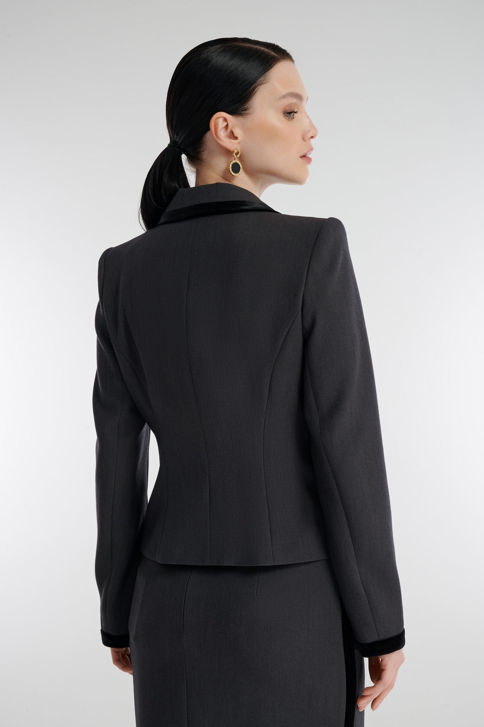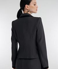 - Бархатная окантовка на лацканах, манжетах и карманах