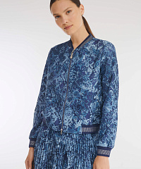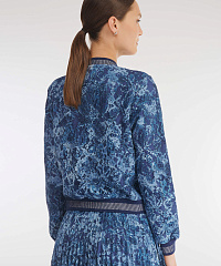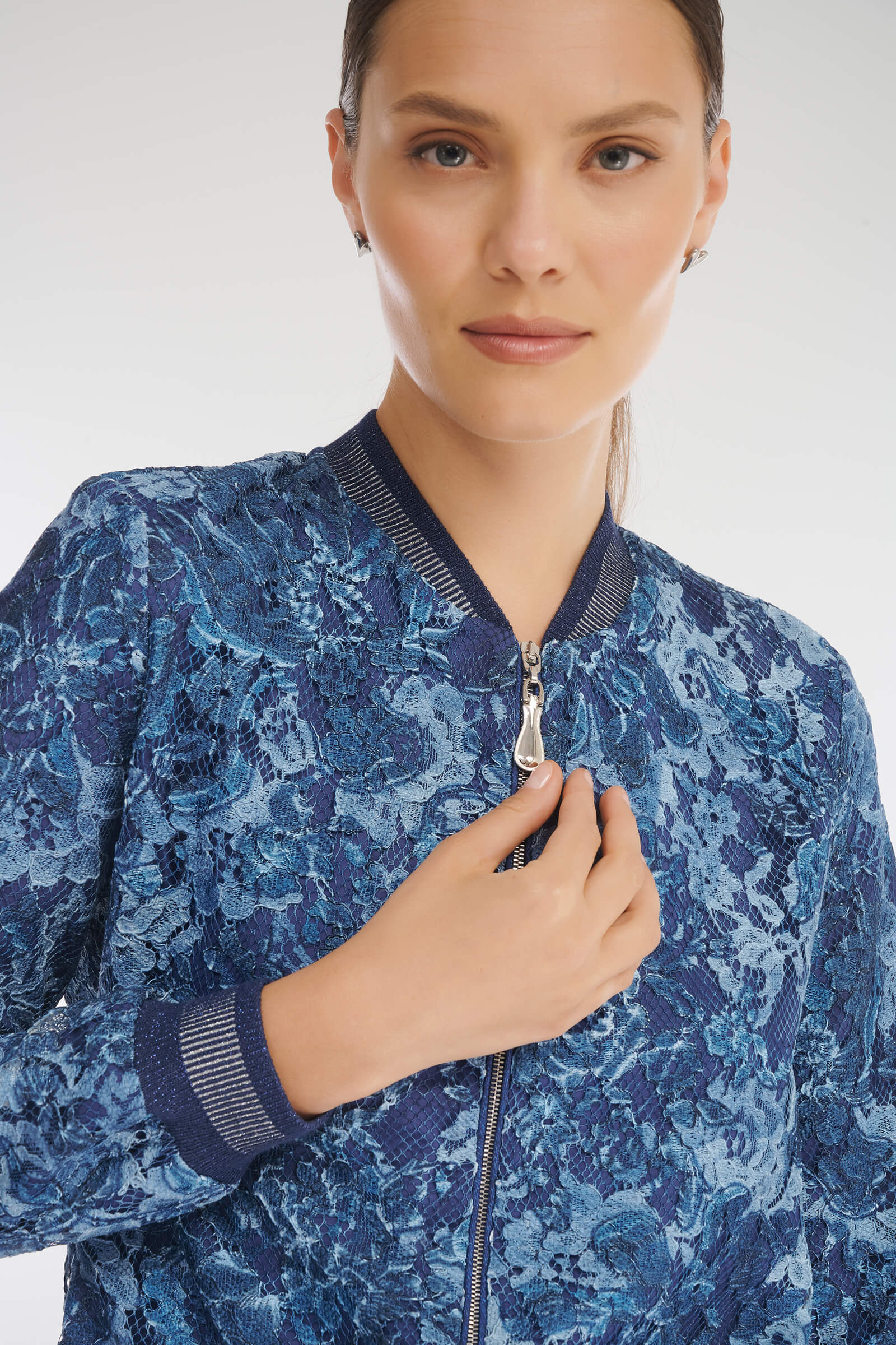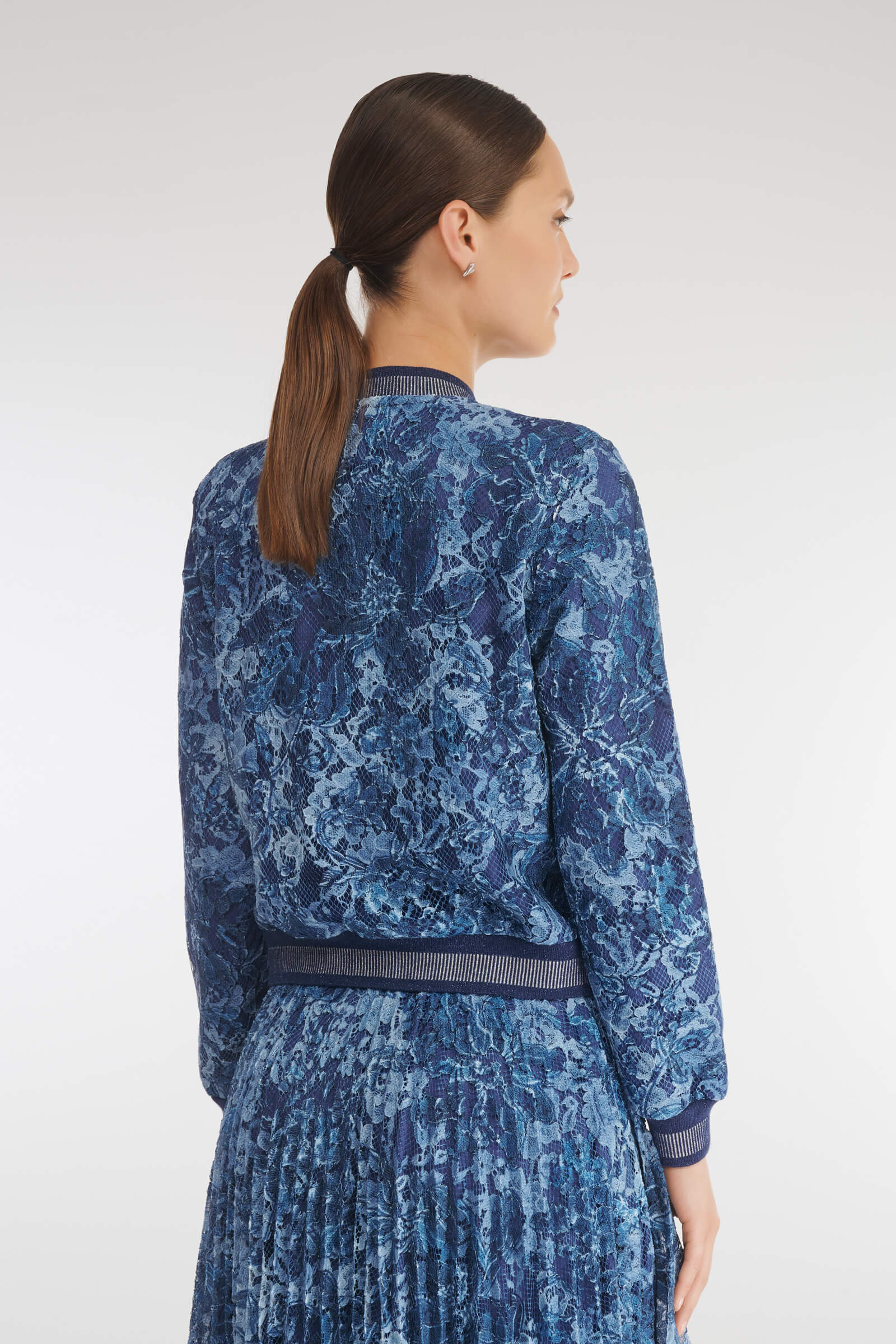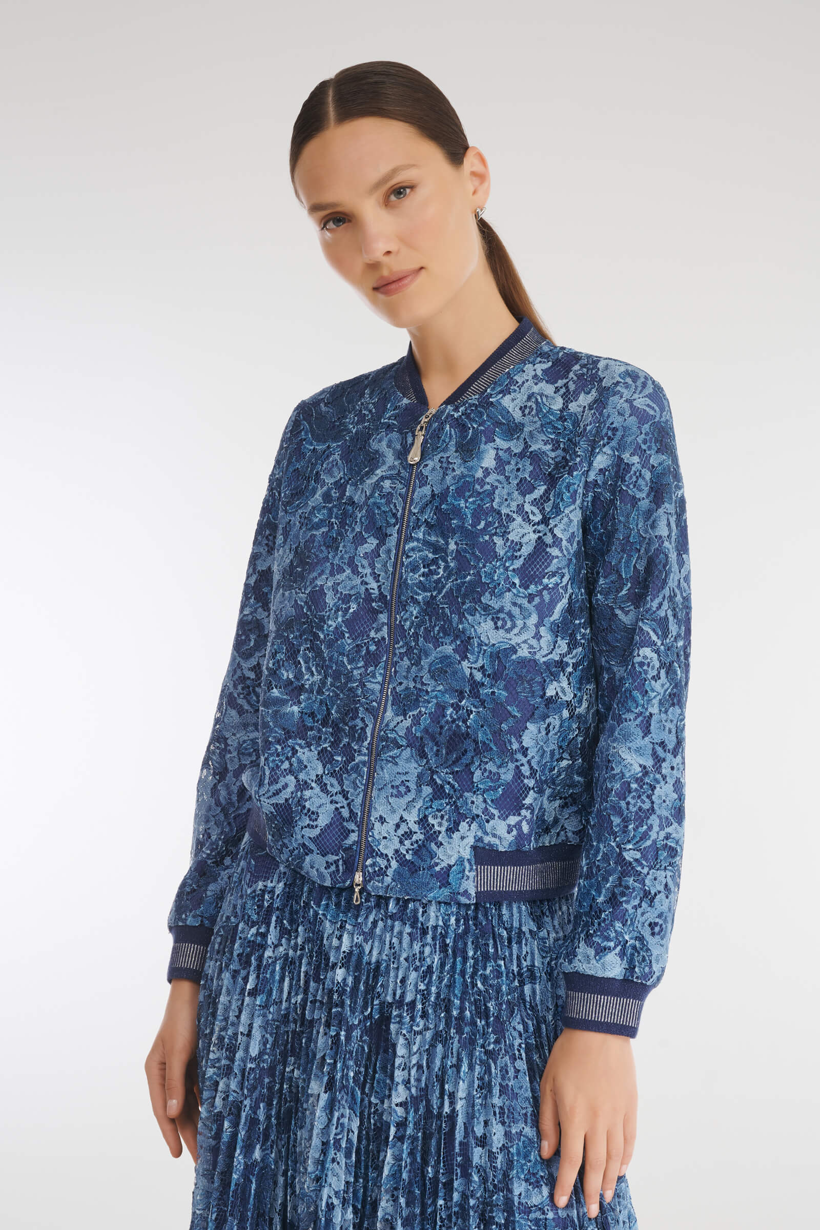 Укороченный бомбер на молнии. Особый шарм модели придает нежный гипюр с цветочным мотивом, выбранный дизайнерами для создания изделия. Классический фасон и трикотажные детали делают бомбер универсальным дополнением как образа в стиле кэжуал, так и наряда для особого случая.