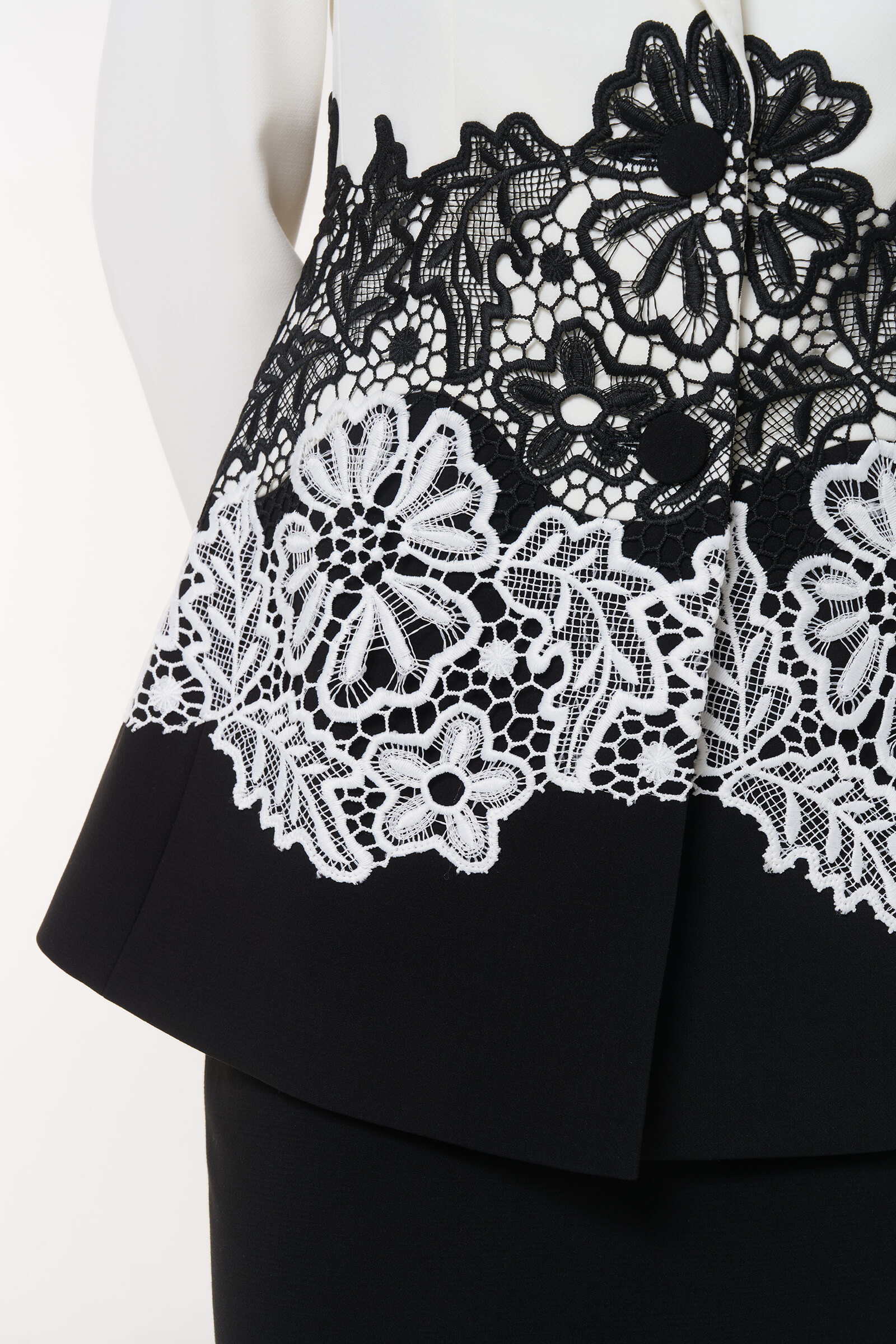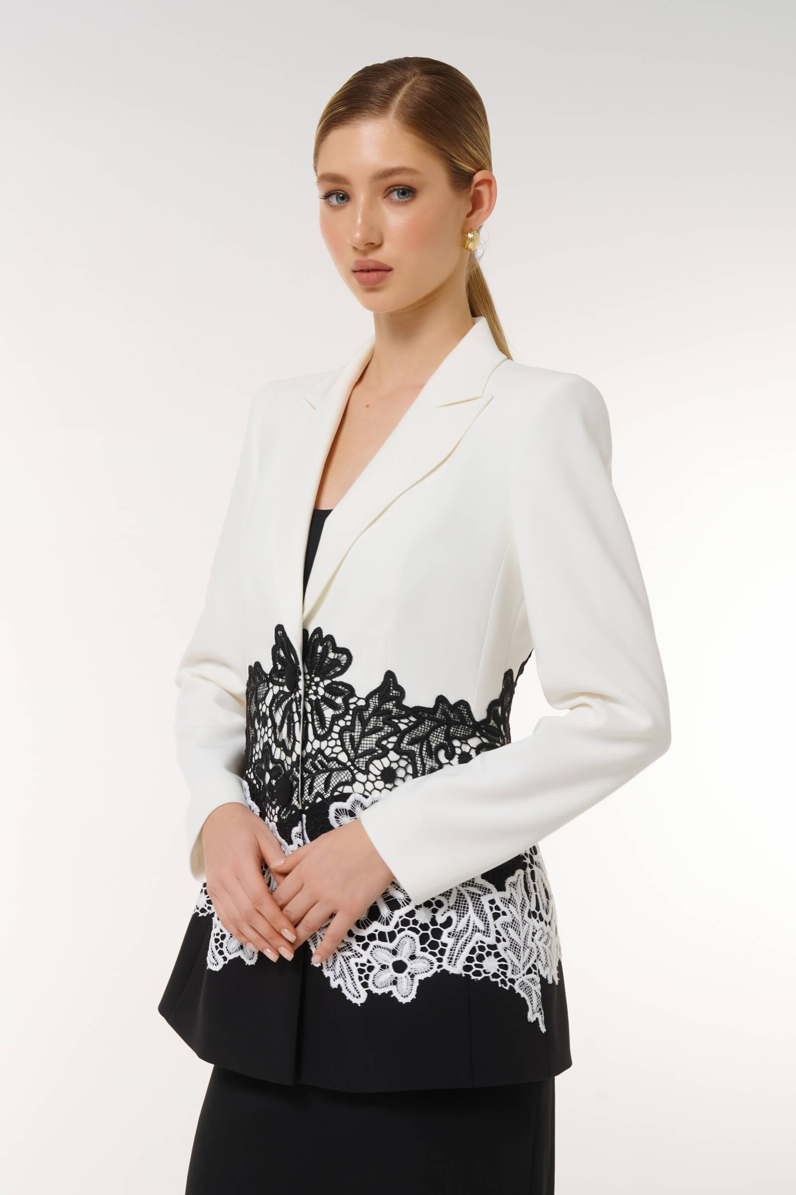 Элегантный пиджак с цветочным кружевом- это идеальное сочетание классики и современности. Роскошная кружевная вышивка создает гармоничный контраст с основным цветом, делая пиджак идеальным выбором для офисных встреч или торжественных мероприятий.