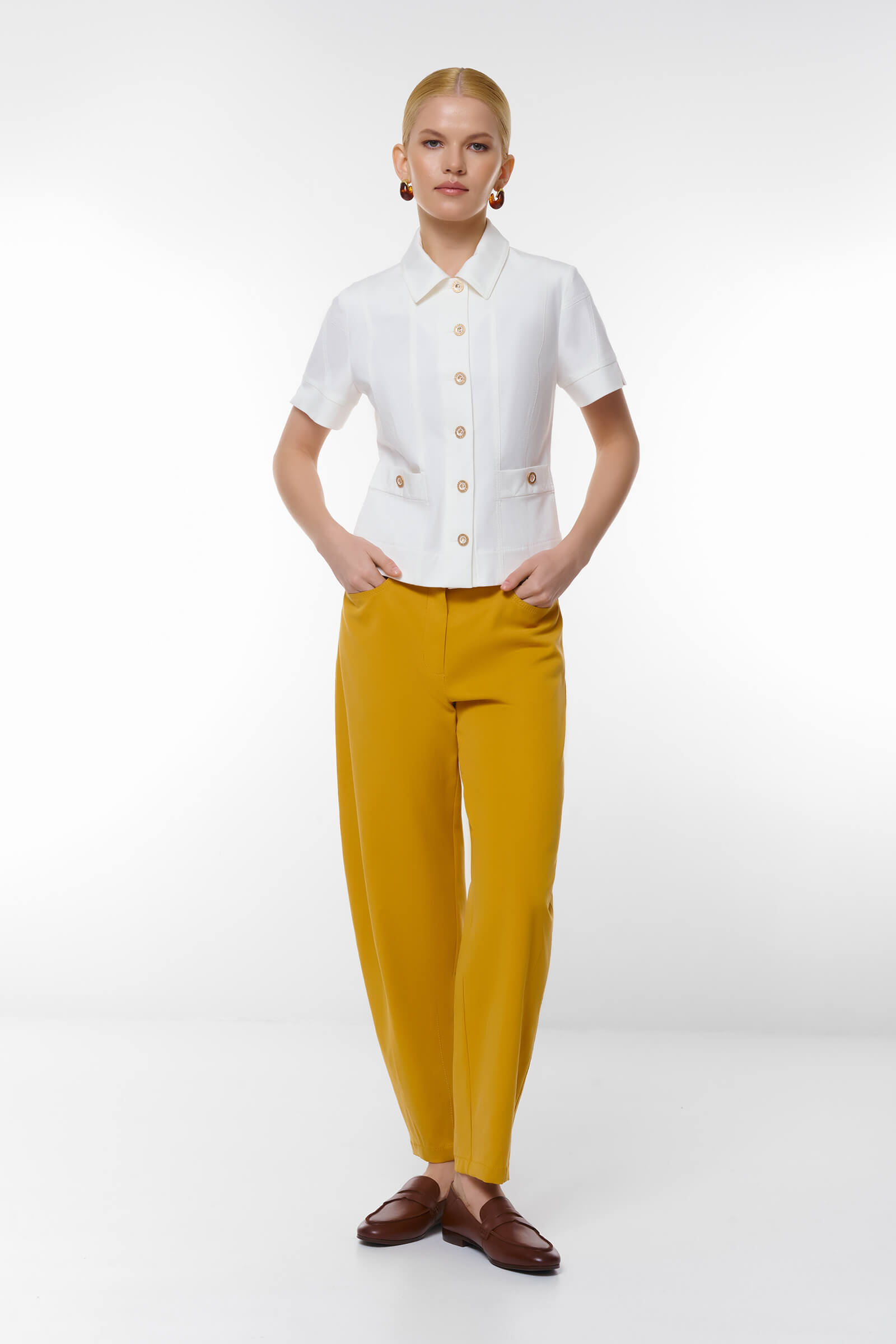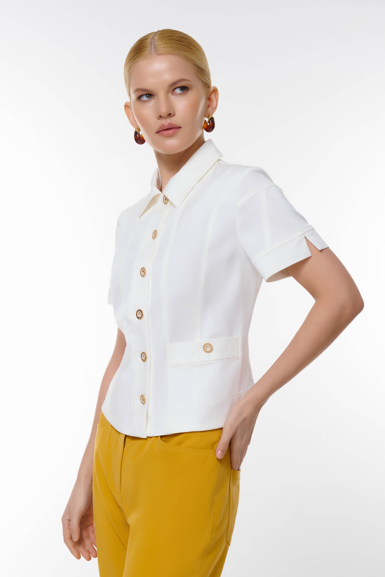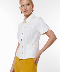 Это стильный жакет с приталенным кроем подчеркивает достоинства фигуры, а короткие рукава добавляют легкость и комфорт. Декорированный пуговицами с декоративными элементами, жакет прекрасно дополняет как классические, так и повседневные образы. Два боковых кармана не только практичны, но и добавляют стильный акцент. Сочетайте его с юбками, брюками или шортами для создания модного и изысканного образа.
