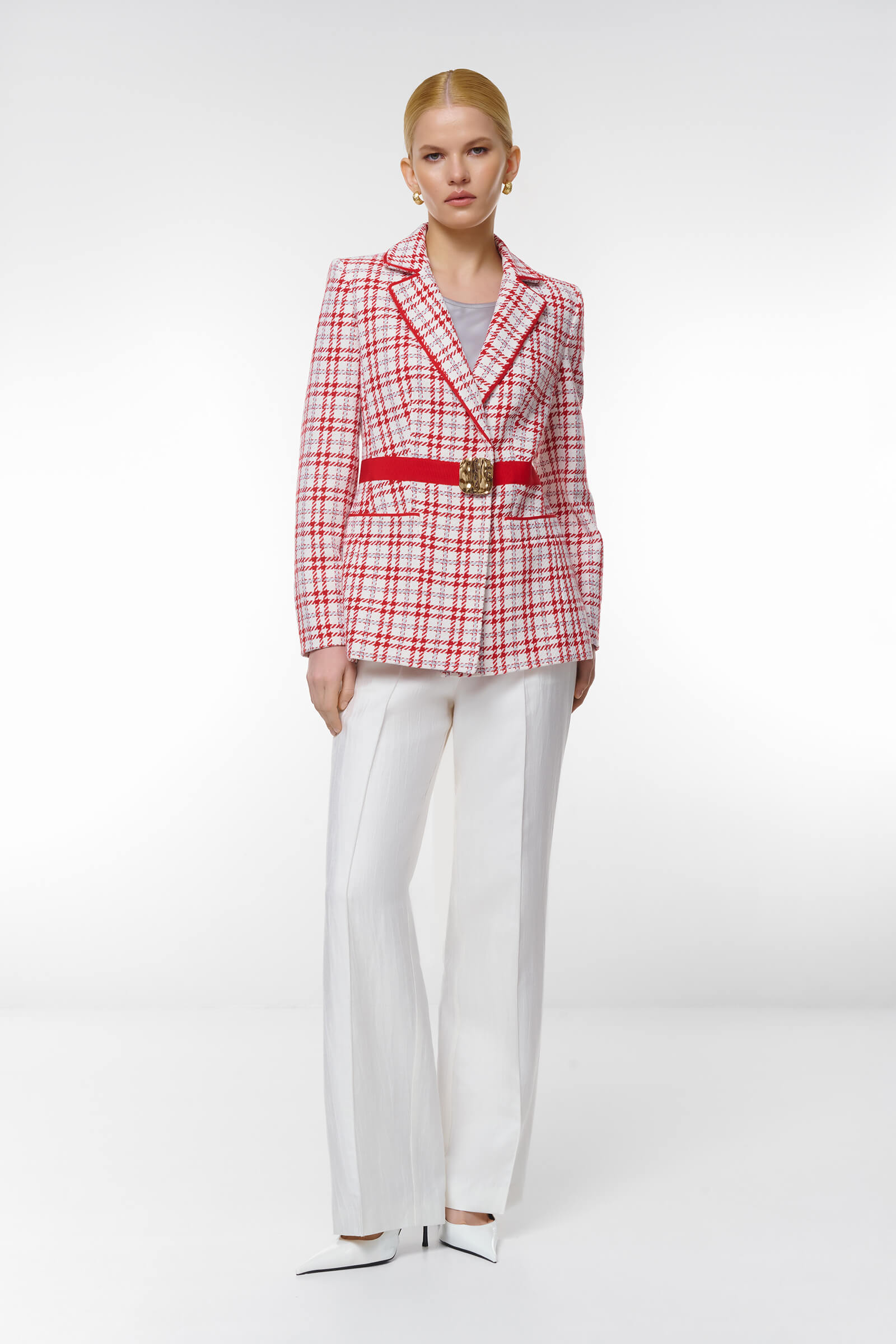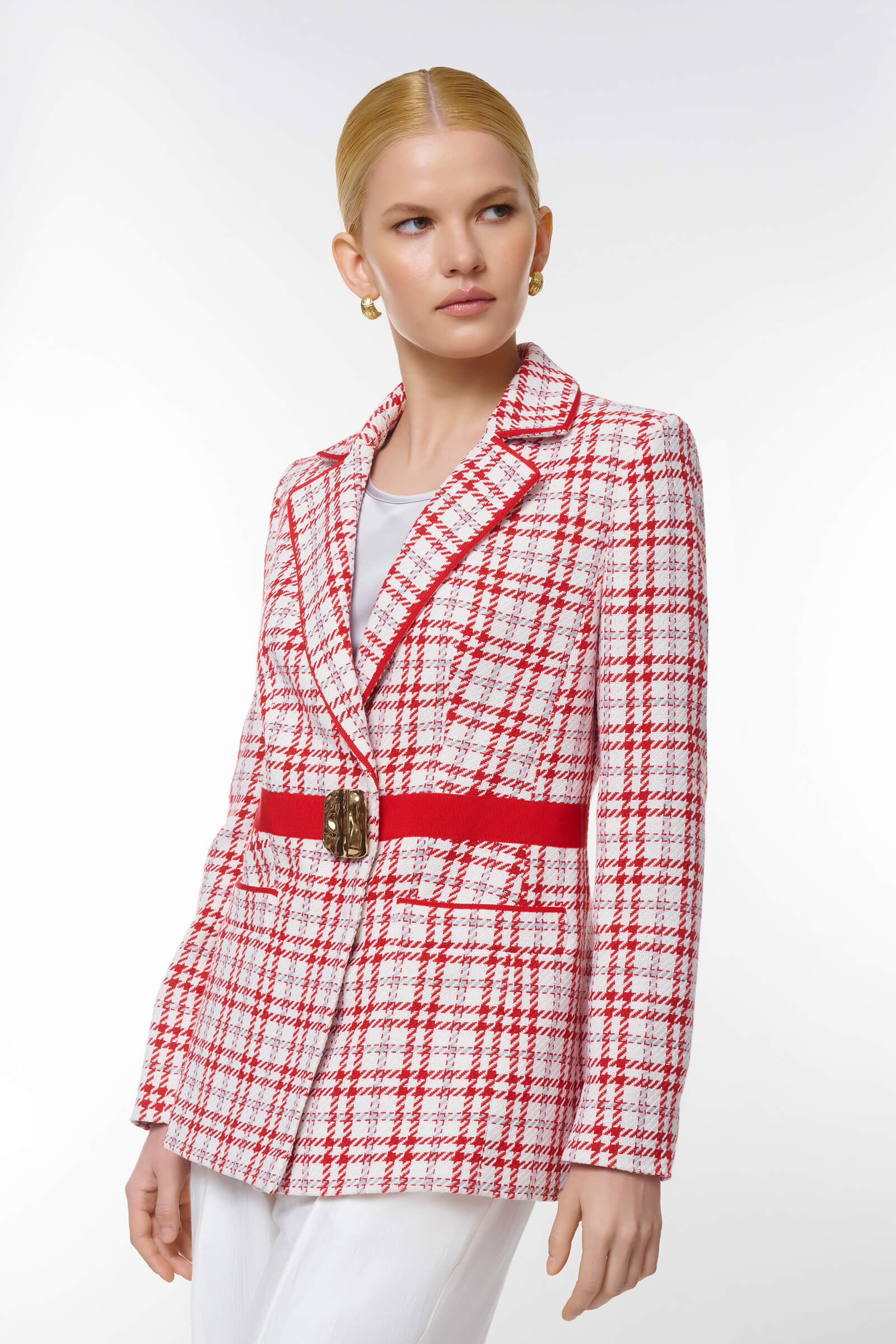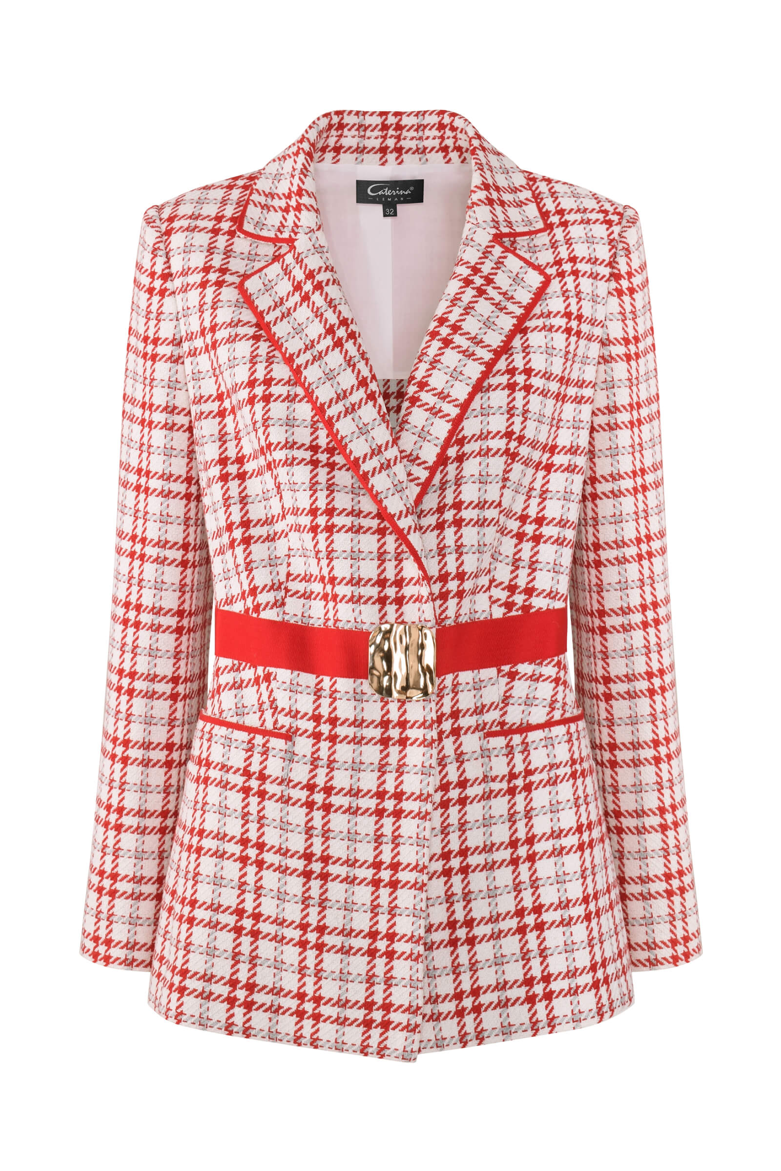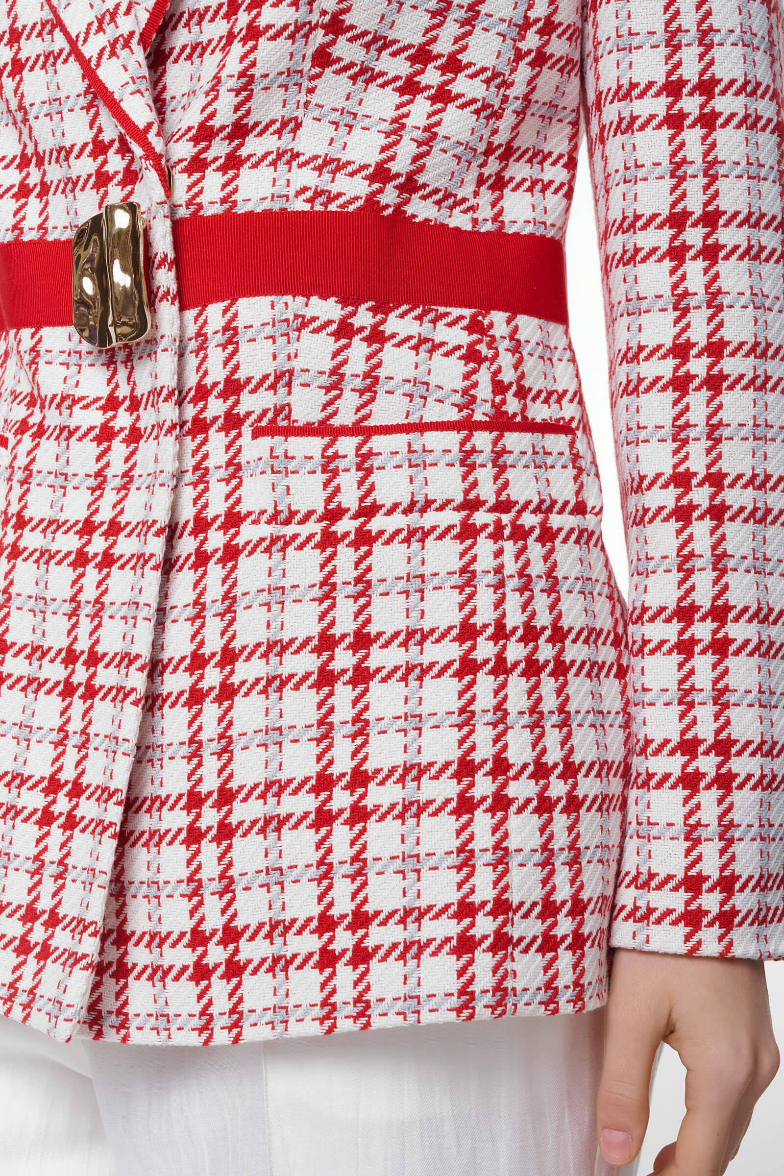 Элегантный жакет с привлекательным клетчатым принтом. Яркий пояс с оригинальной пряжкой подчеркивает талию и придает современный вид. Идеально подходит для офисных образов и вечерних выходов.